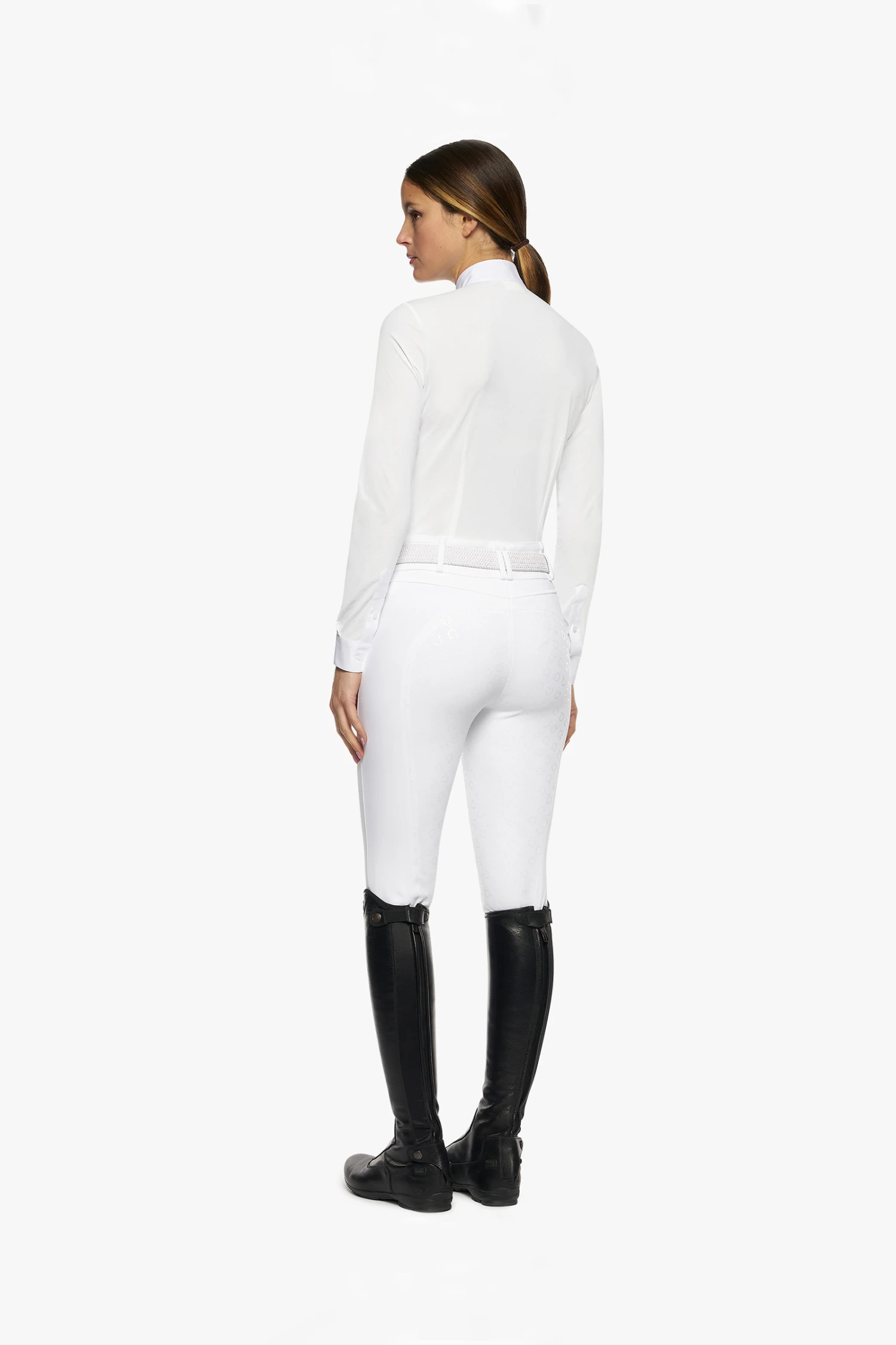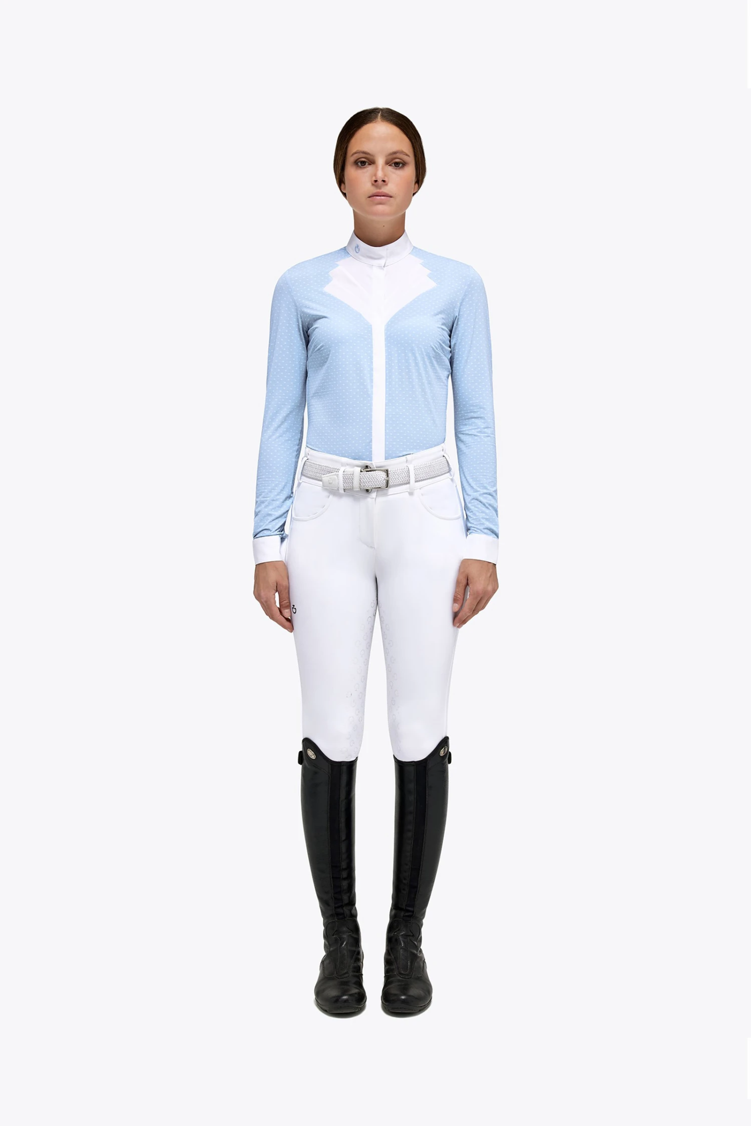 Das langärmlige Hunter Shirt für Damen hat einen Stehkragen aus fester Baumwolle und einen Latz mit Plisseedetails und versteckten Knöpfen. Dieses Turniershirt ist aus hoch atmungsaktivem, technischem Bi-Stretch-Gewebe gefertigt, das sich perfekt an den Körper anpasst und deine Bewegungen mitmacht. Es ist mit einem sehr kleinen Logo am Kragen versehen.