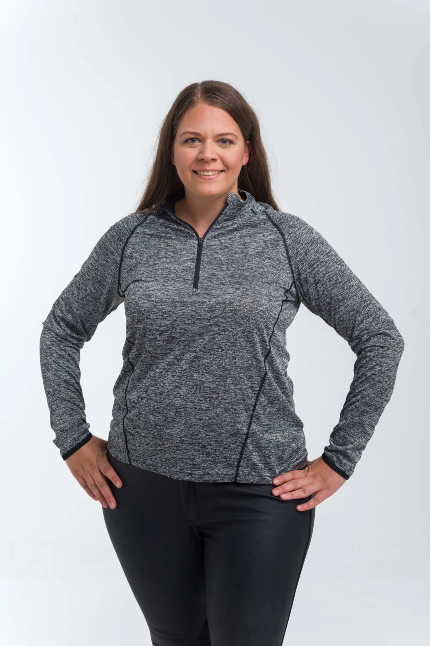 Ein Reitoberteil, das das ganze Jahr über getragen werden kann. Leicht trocknend und atmungsaktiv. Mit silbernem Pferdegebiss am Hals.