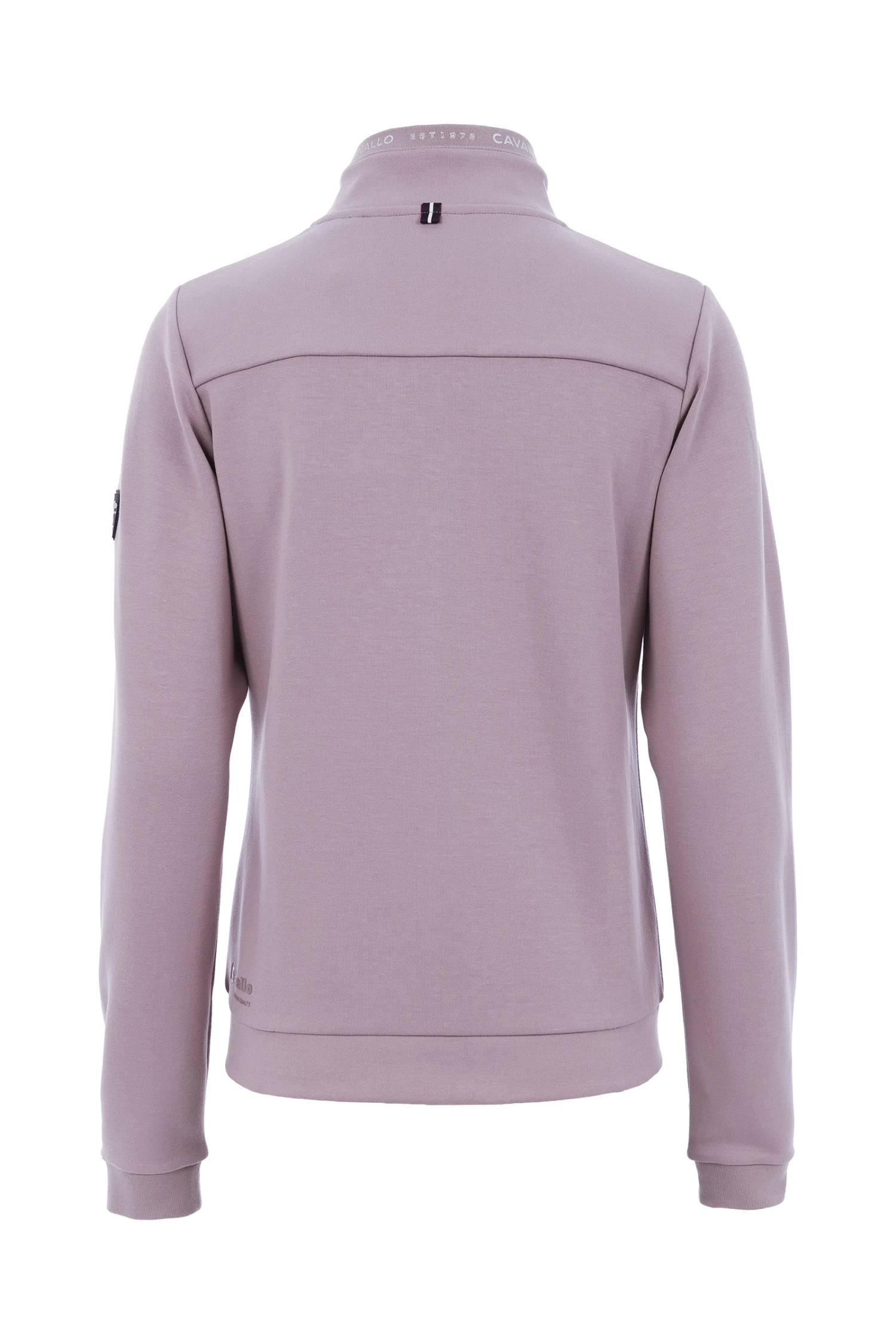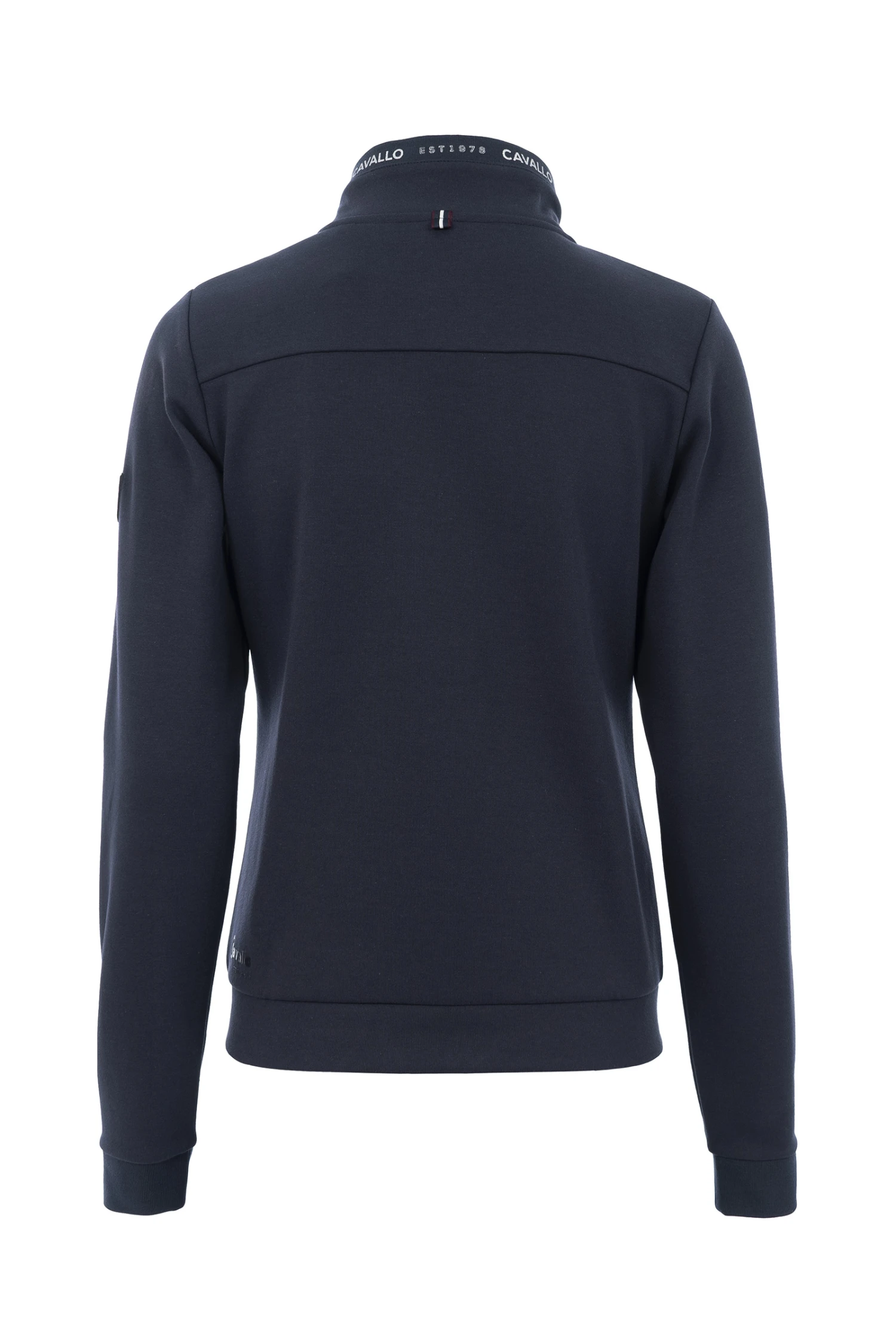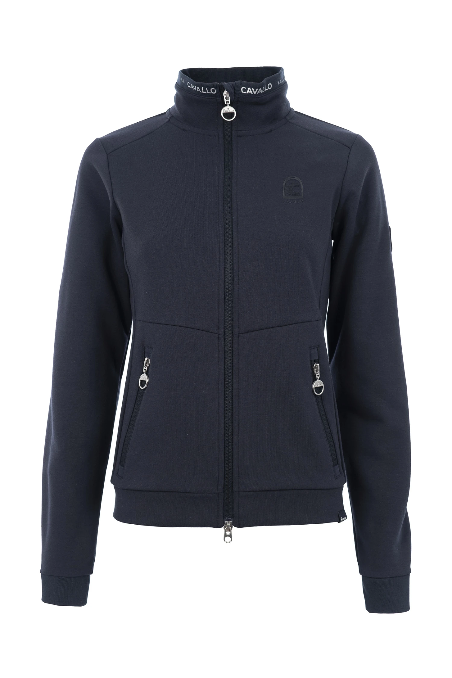 In sportlich eleganter Optik. Rippbund an Kragen und Ärmelabschlüssen. Rippe an Kragen bedruckt mit Cavallo Schriftzug in Silber. Zwei vordere Eingrifftaschen mit Reißverschlüssen. 2-Wege-Reißverschluss an der Front. Alle sichtbaren Reißverschlüsse sind mit Schmuckgriff und Kristall versehen. Tonales, erhabenes Cavallo Logo auf der linken Brust.