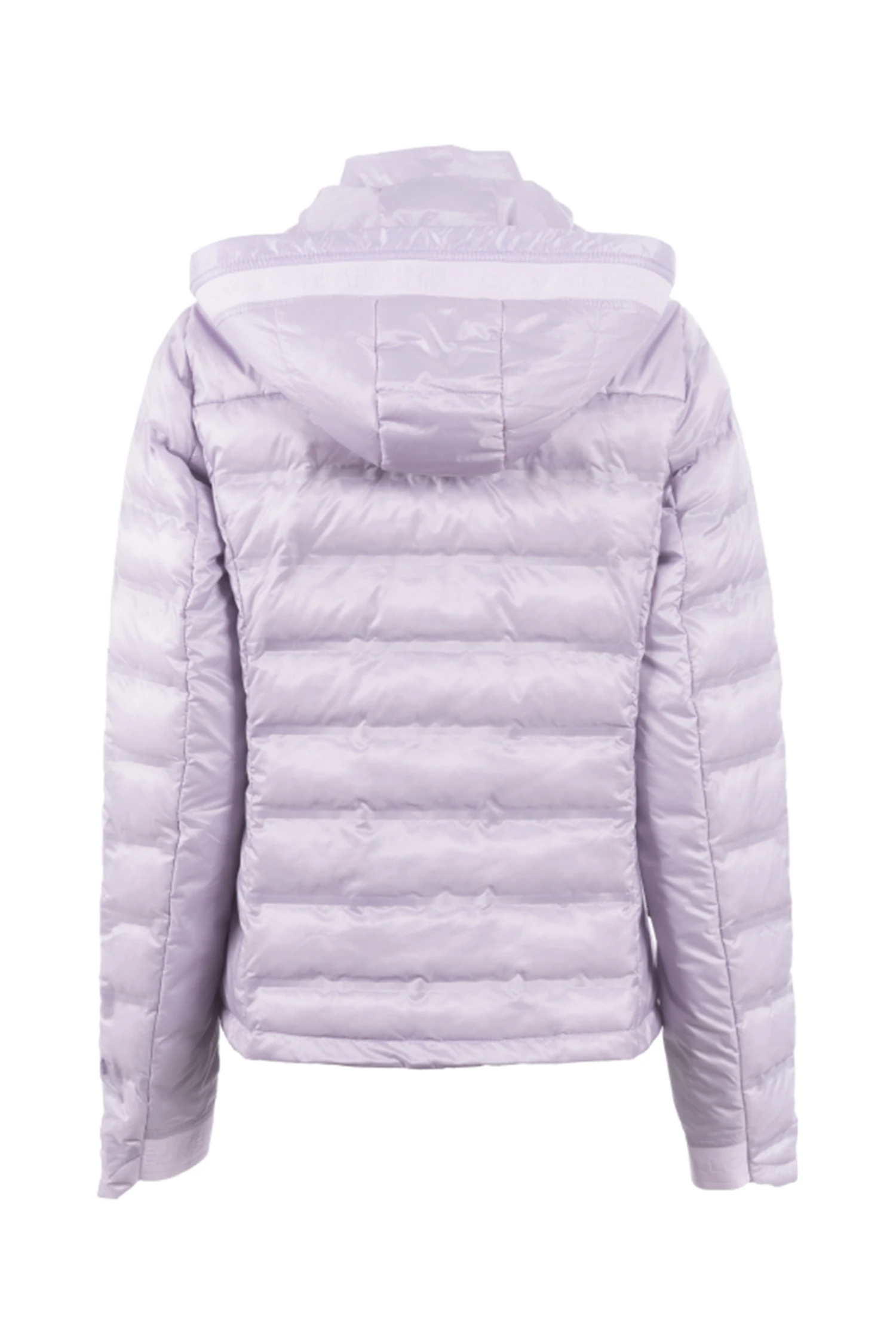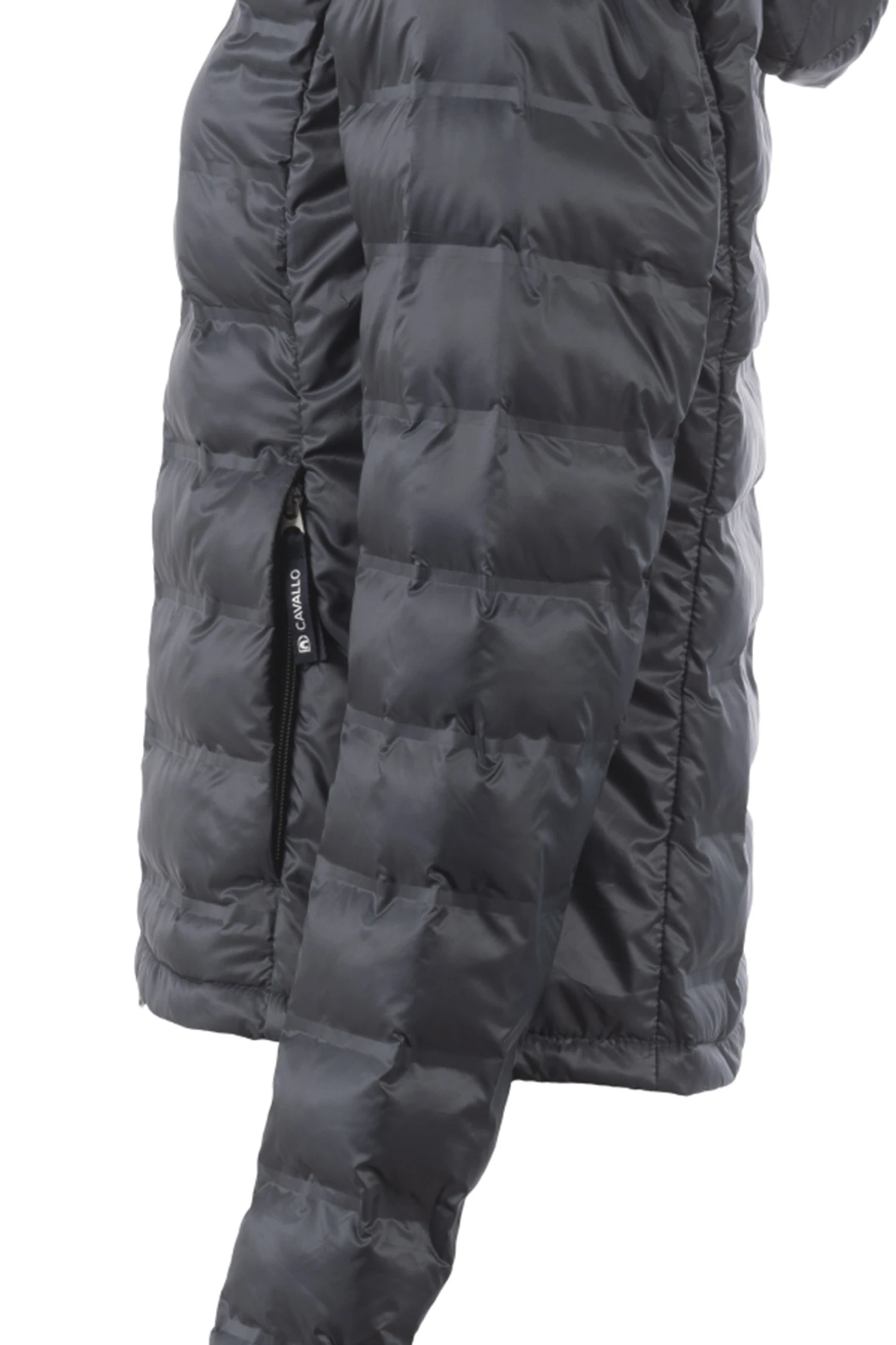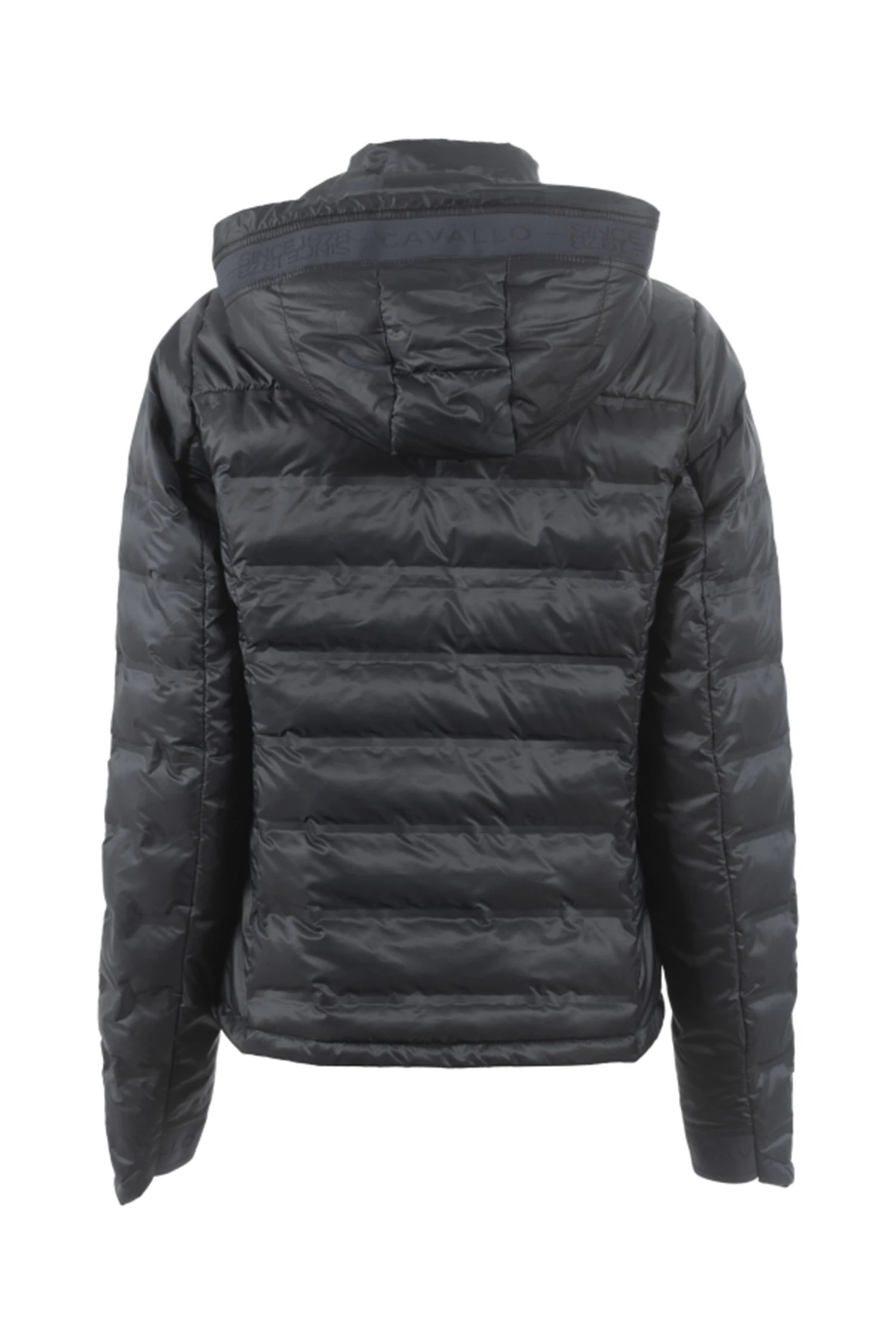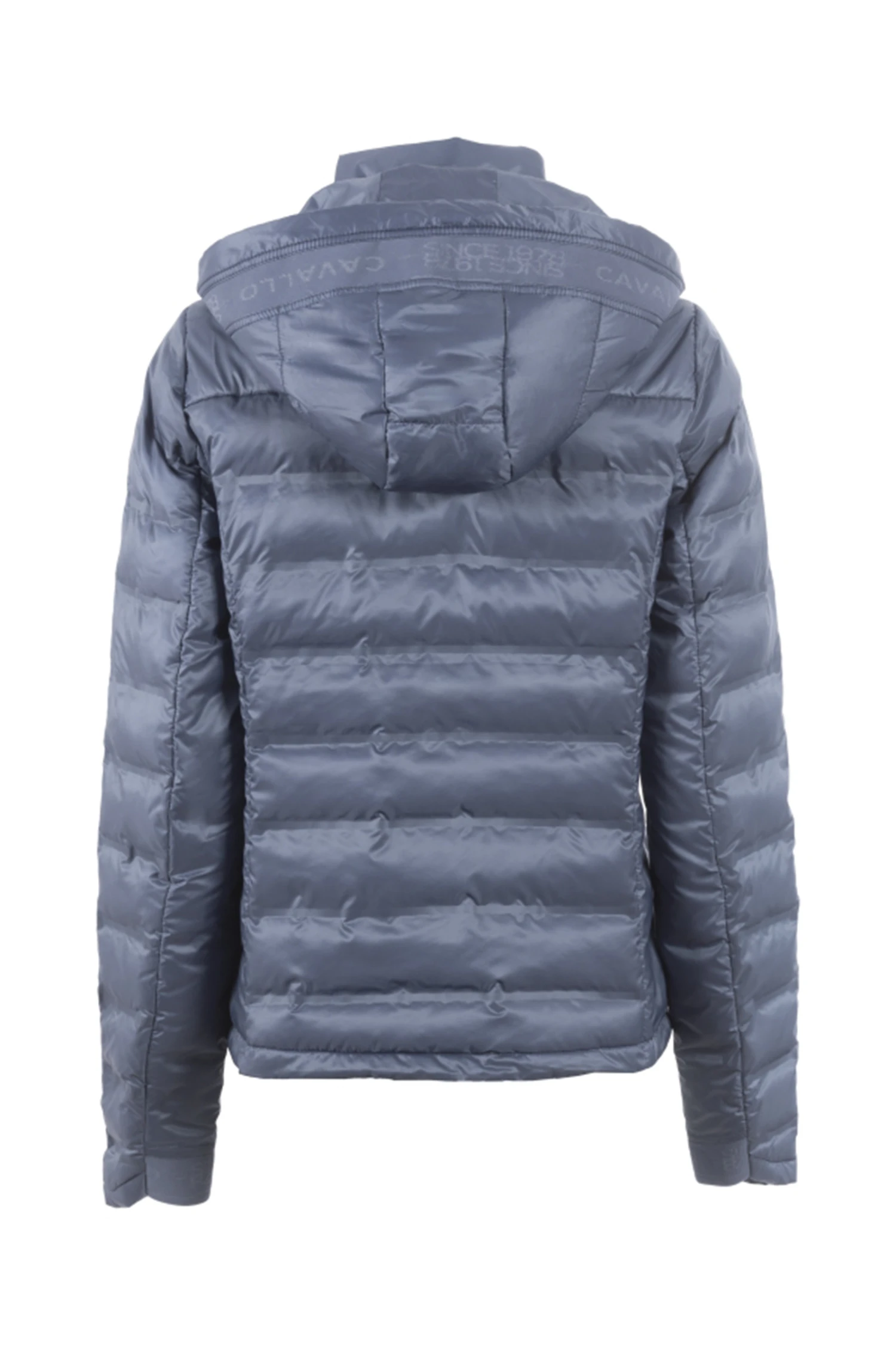 Mit Fake Daune gefüllt Jacke mit modernem Holloweffekt im mittleren Vorder-und Rückenteil sowie am Oberarm. Abnehmbare Kapuze im Rücken fixierbar. Kapuze und Ärmel sind mit einem tonalen Logoband verziert. Kapuze mit Kordelzug. Ärmelsaum verläuft Handrücken bedeckend in der vorderen Mitte 2-Wege-Reißverschluss sowie zwei Eingriffstaschen. Mit Reißverschluss und blauem Cavallo Webbandanhänger. Silbernes Artwork auf der Brust.