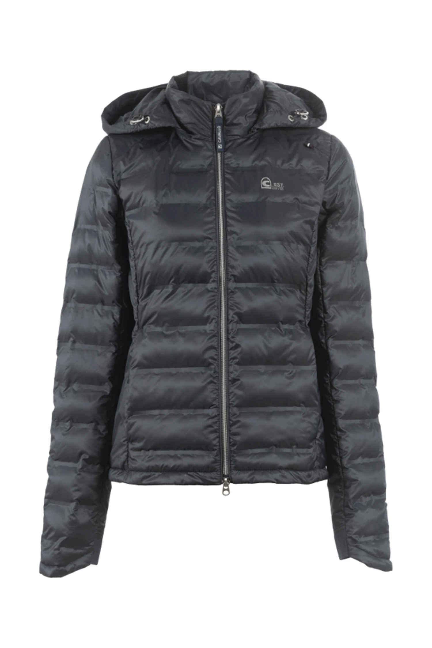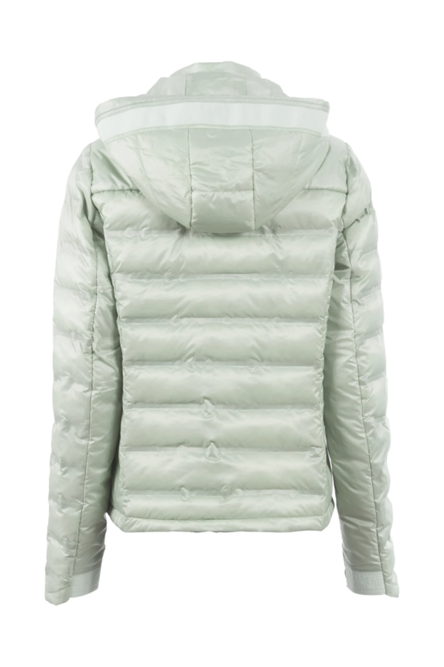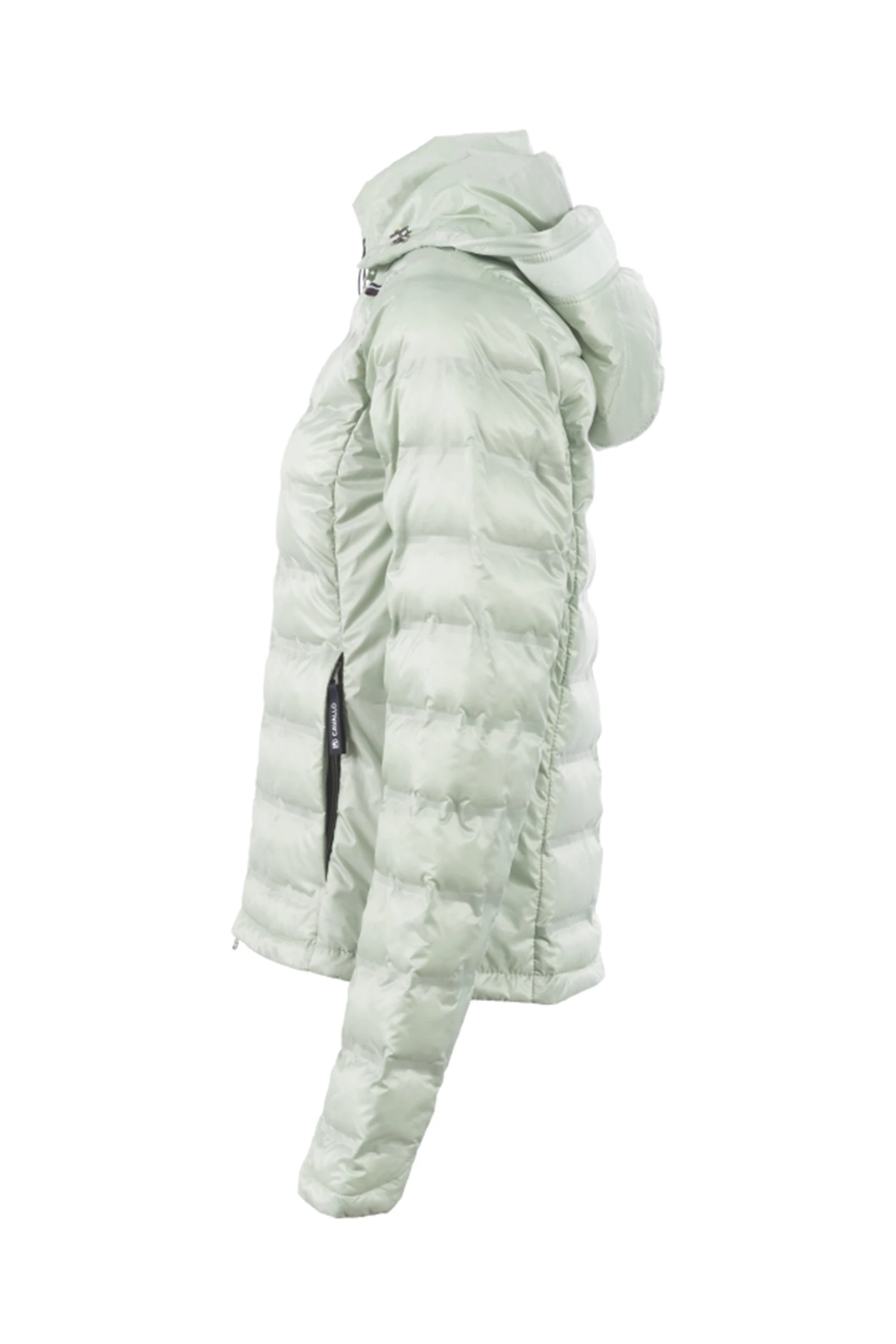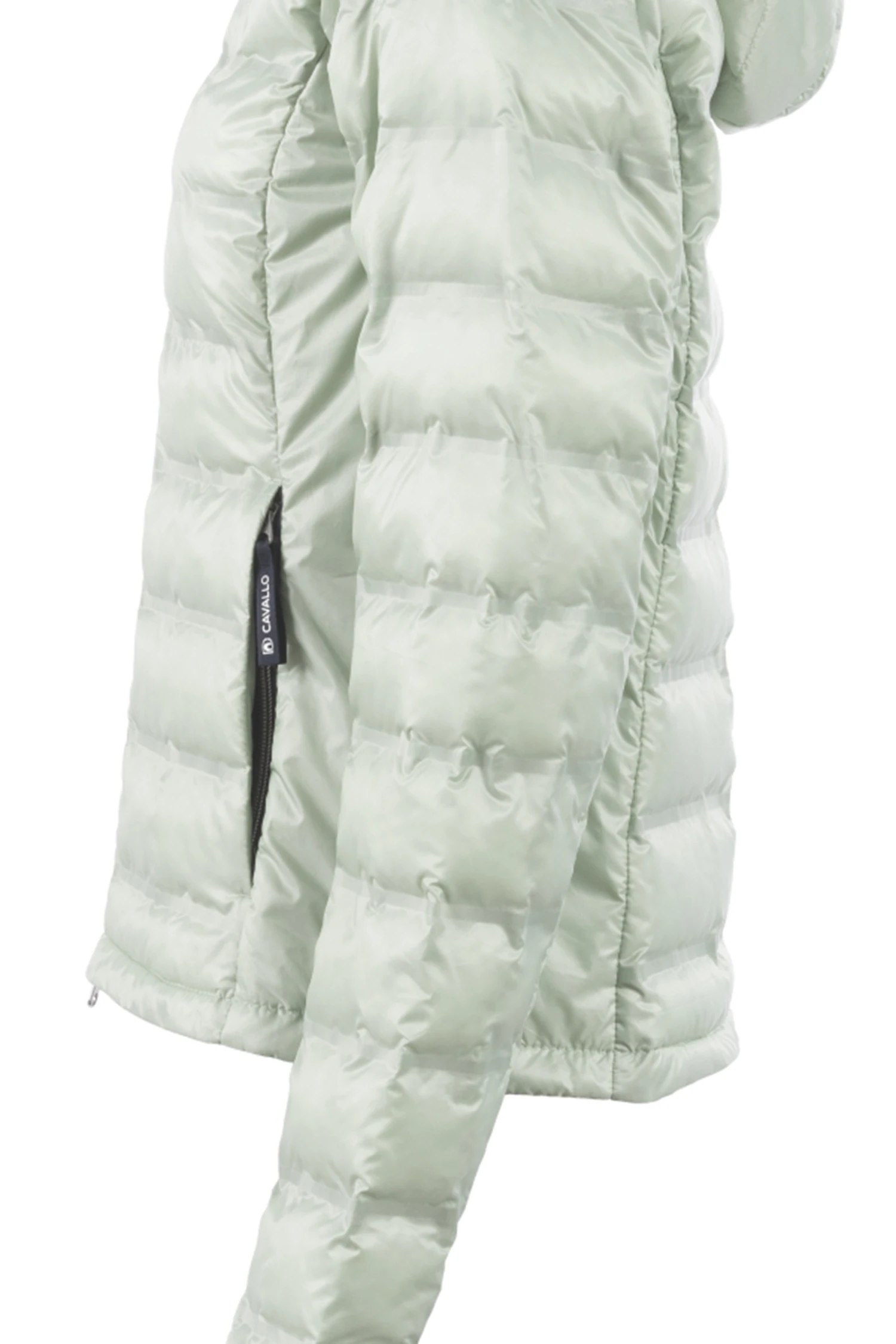 Mit Fake Daune gefüllt Jacke mit modernem Holloweffekt im mittleren Vorder-und Rückenteil sowie am Oberarm. Abnehmbare Kapuze im Rücken fixierbar. Kapuze und Ärmel sind mit einem tonalen Logoband verziert. Kapuze mit Kordelzug. Ärmelsaum verläuft Handrücken bedeckend in der vorderen Mitte 2-Wege-Reißverschluss sowie zwei Eingriffstaschen. Mit Reißverschluss und blauem Cavallo Webbandanhänger. Silbernes Artwork auf der Brust.