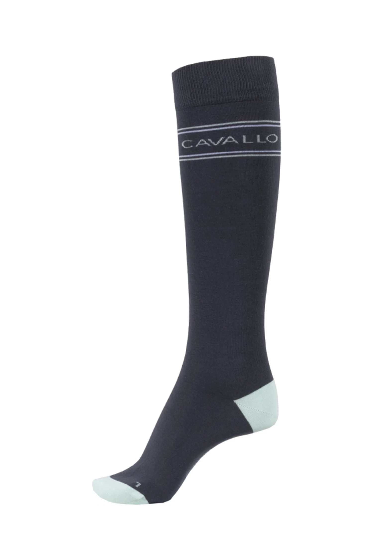 Dünner Schaft mit eingestrickten Streifen und Cavallo Logo. Ferse und Fußspitze in Kontrastfarbe. R/L Kennzeichnung.