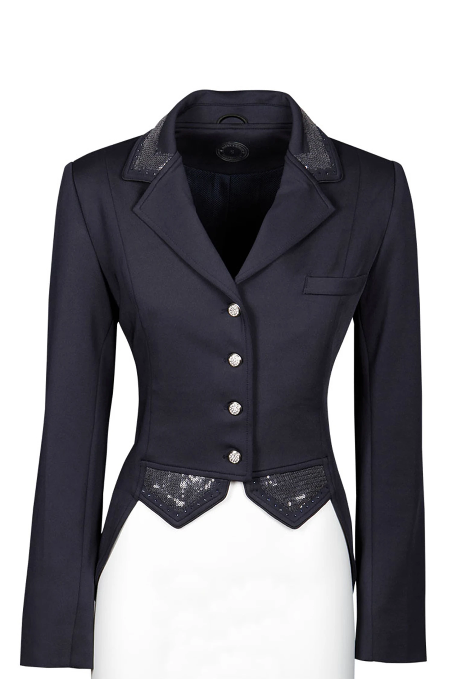 Edles Turnierjackett aus hochwertigem Stretch-Material. Die Jacke ist mit einem Kristallknopf und darunter liegendem Reißverschluss für perfekte Passform ausgestattet, am Kragen und den Gehschlitzen sind farblich passende Pailletten/Kristalle und eine Paspel angebracht. Mit Zierknöpfen.