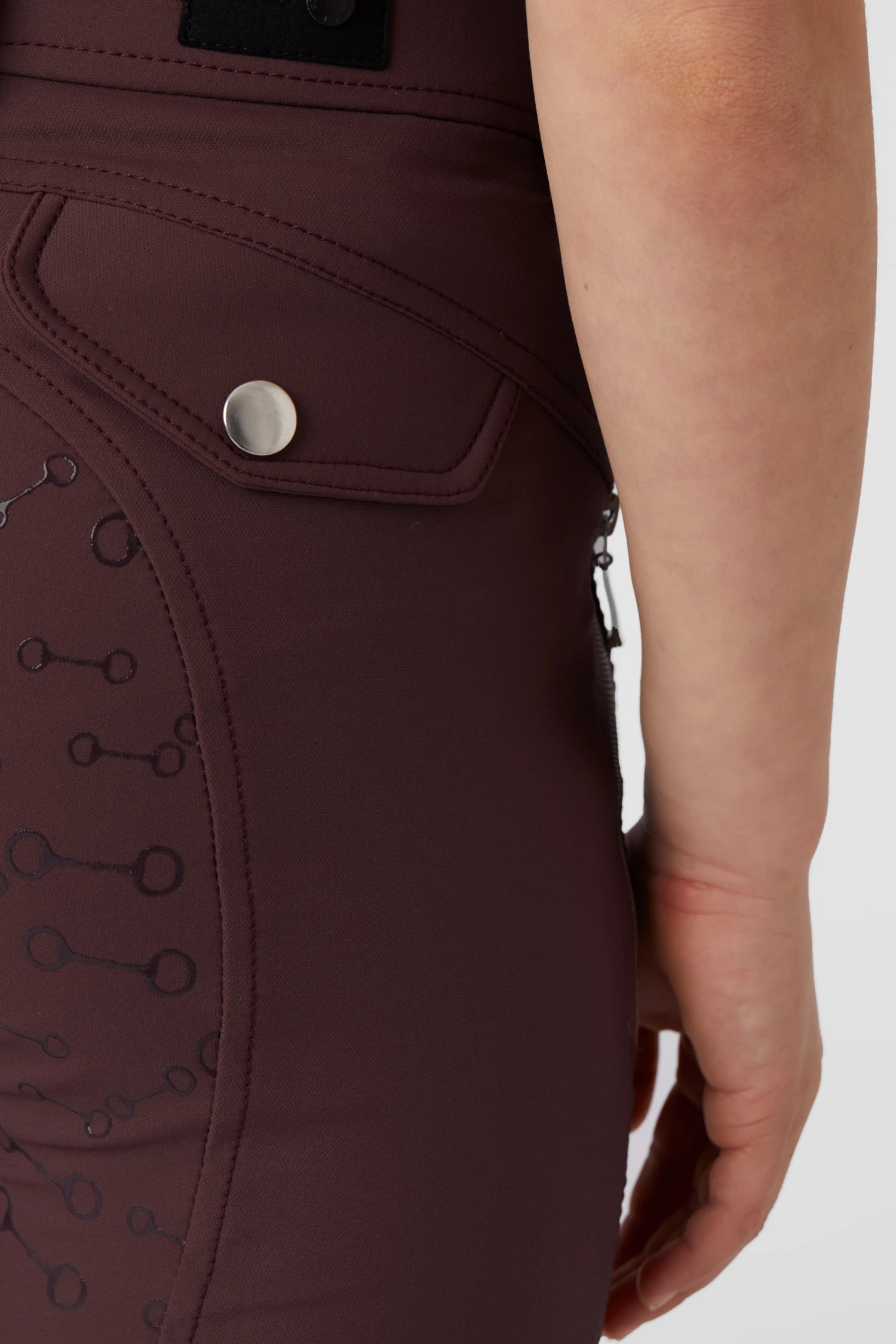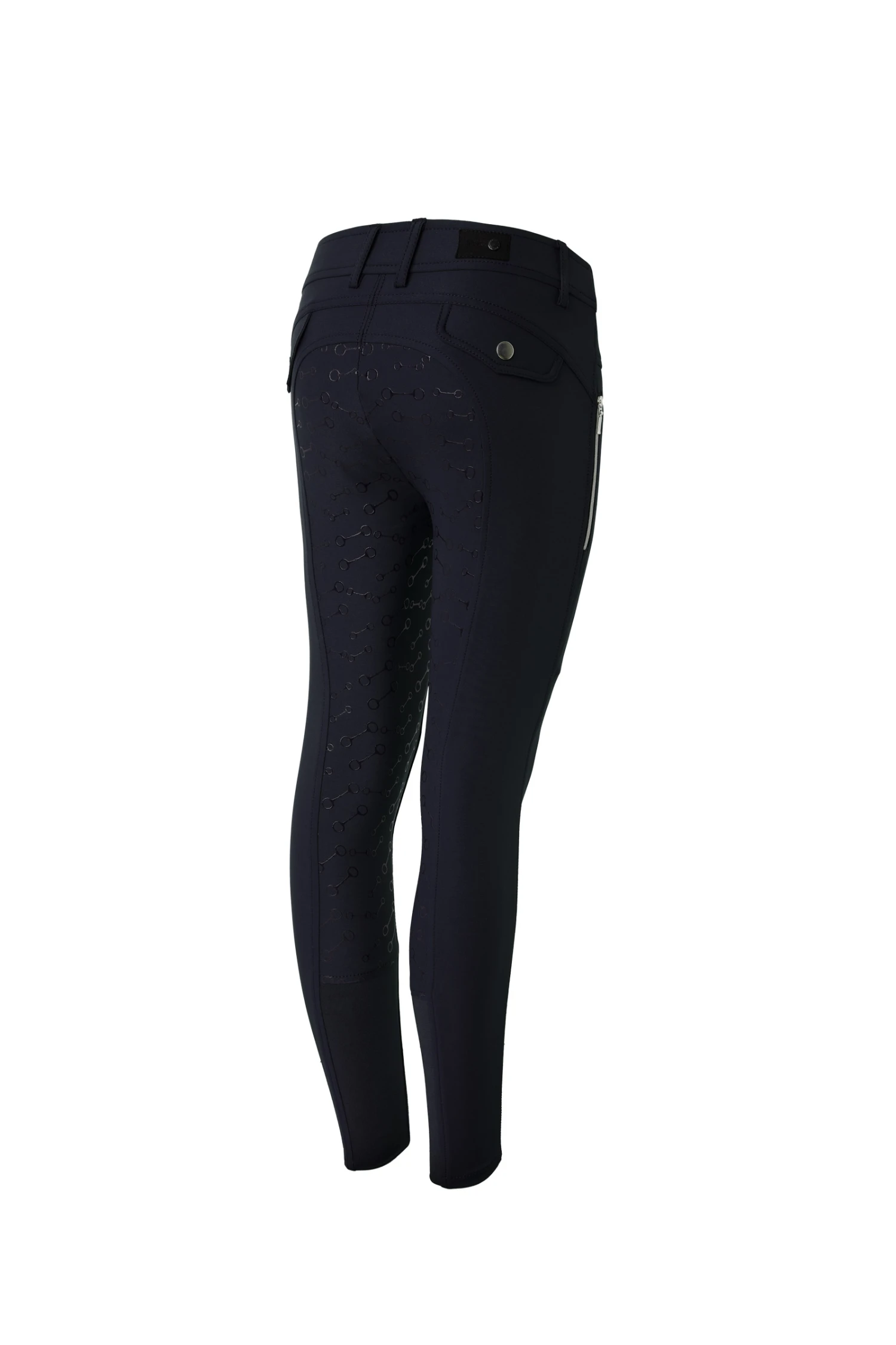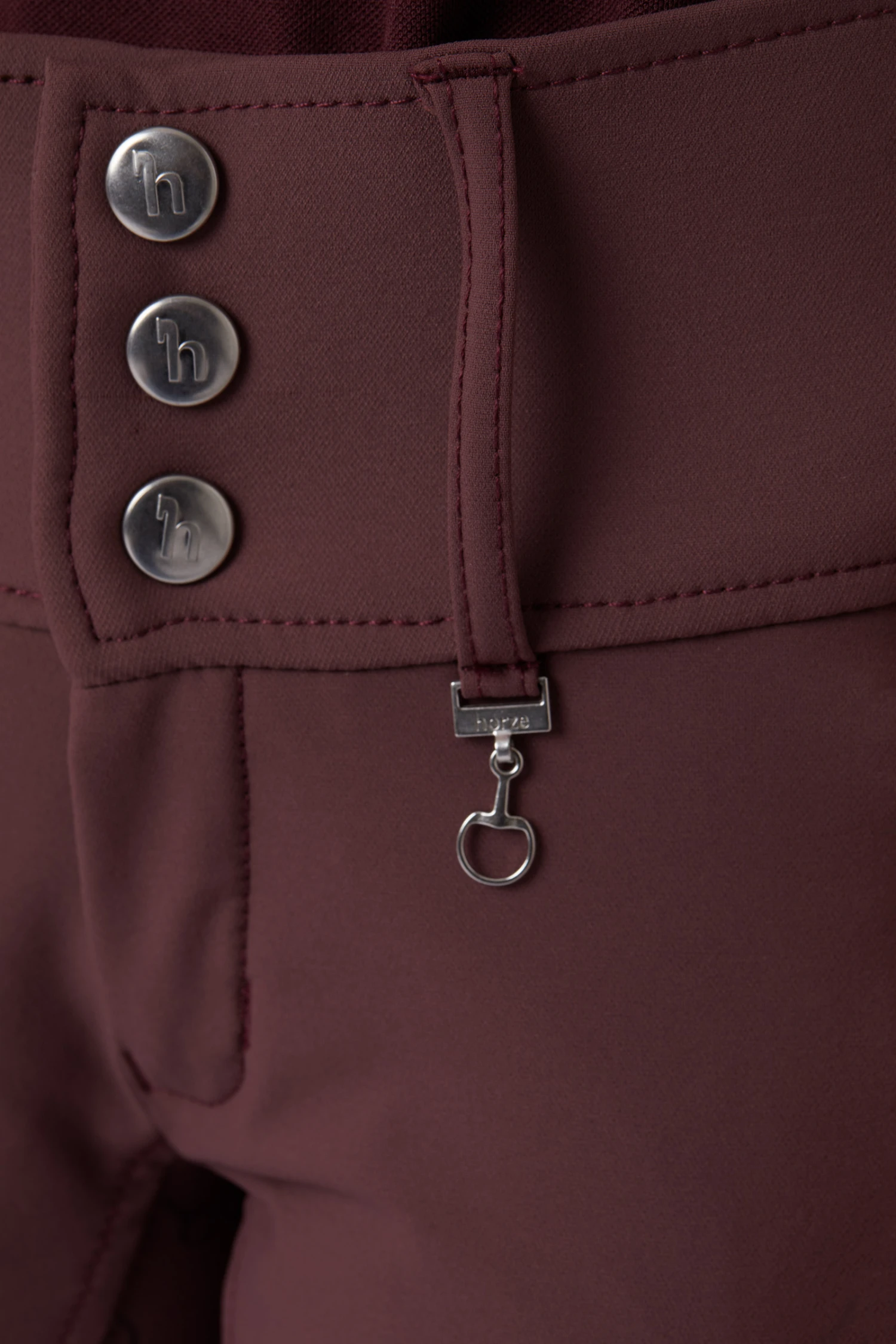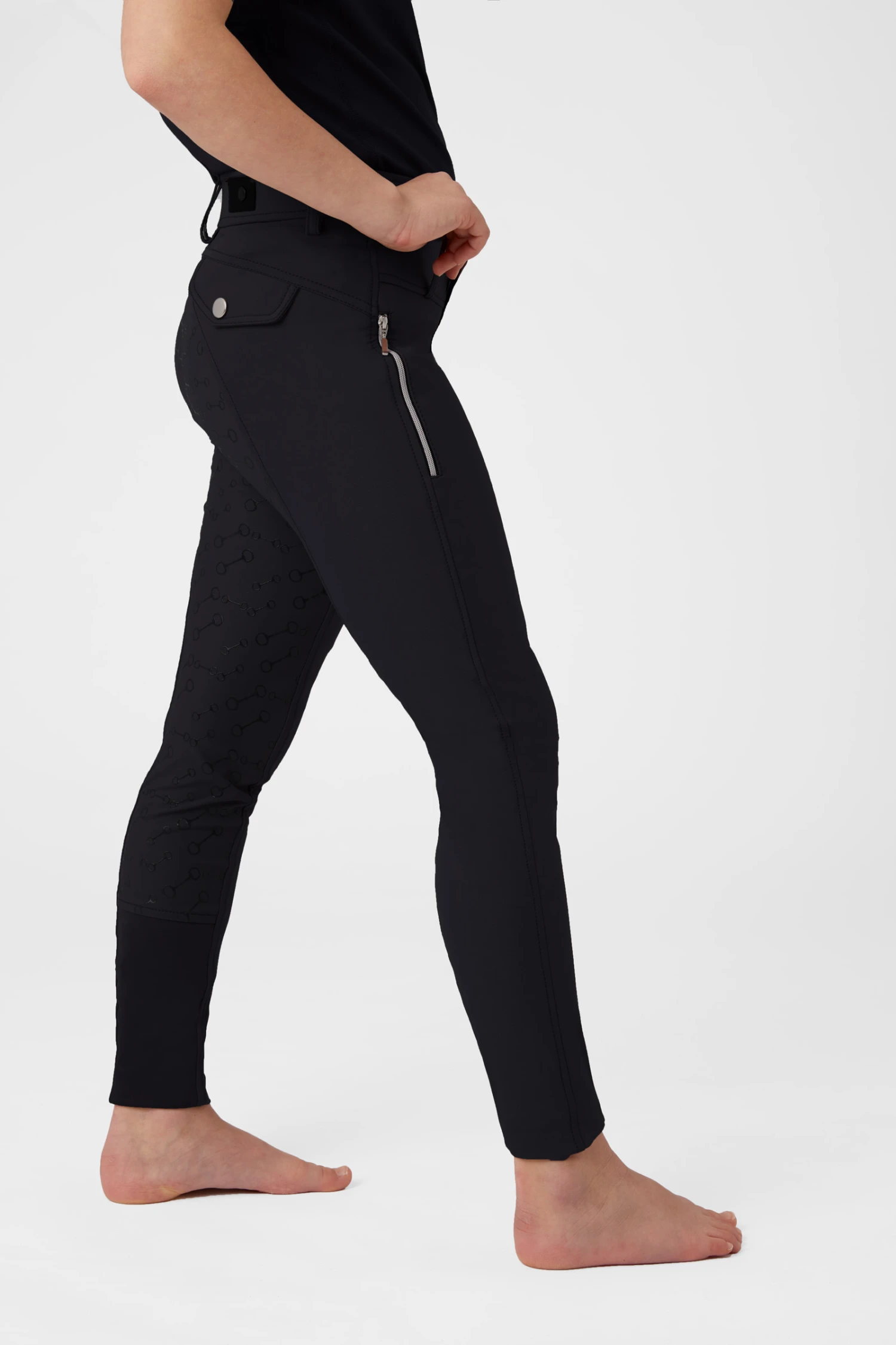 Die Horze Andrea Reithose ist mit schmeichelhaften Nähten auf der Vorderseite versehen, die die Beine optisch verlängern. Der Bund mit drei Knöpfen ist vorne höher, was ein stilvolles Detail darstellt. Zwei Reißverschlusstaschen bieten Platz für Habseligkeiten, und der Silikonvollbesatz hält junge Reiter im Sattel.