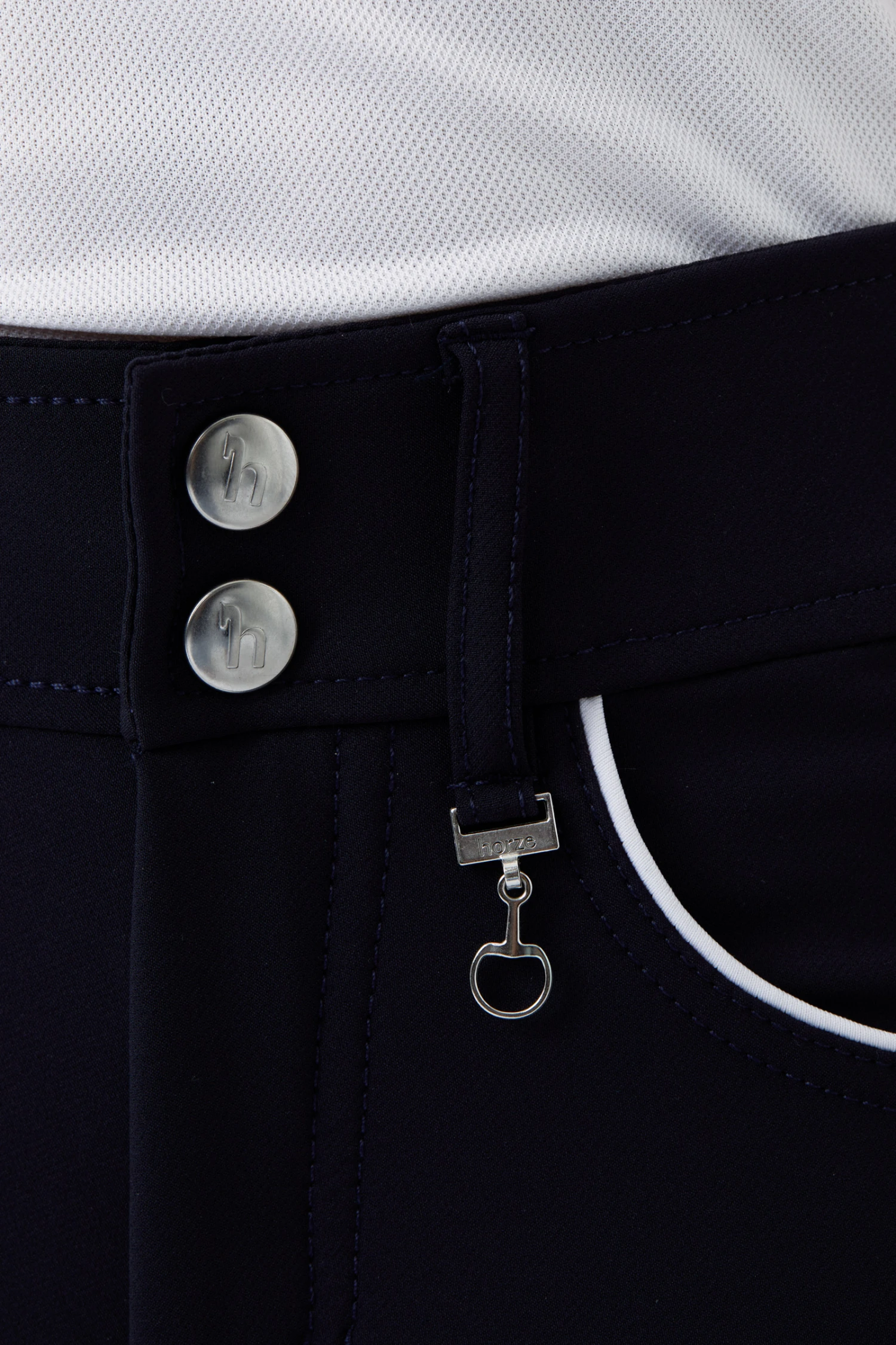 Die Horze Aubrech Reithose verfügt über einen Silikonvollbesatz, der für den idealen Halt im Sattel sorgt. Ein hoher Bund bietet die ideale Unterstützung für Bauch und Rücken. Elegante Kontraststreifen und der Logoprint liefern bezaubernde Details und lassen junge Reiter professionell aussehen.