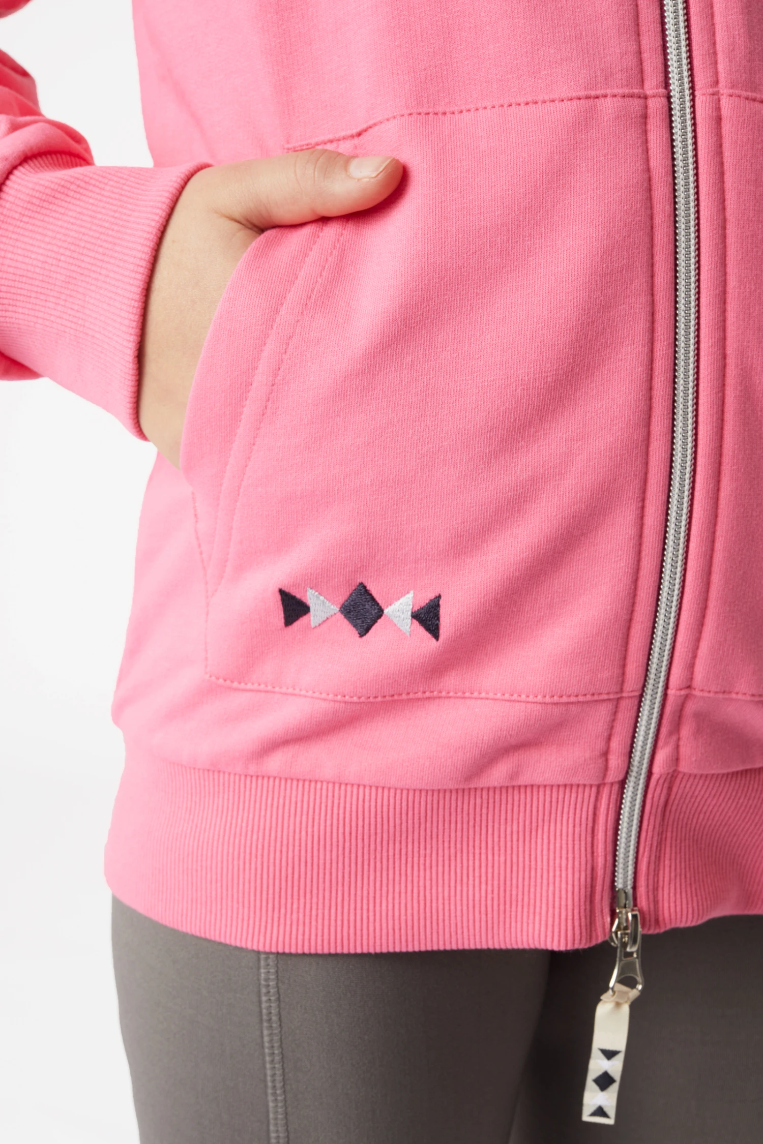Einfache Sweatshirtjacke mit Kapuze und Zwei-Wege-Reißverschluss, die beim Reiten sehr praktisch ist. Rippbündchen an Saum und Ärmeln sorgen für einen guten Sitz. Aztekenmuster auf dem Reißverschluss und der Vordertasche, passend zum Rest der Kollektion. Abgeschrägte Vordertaschen neben dem Reißverschluss.