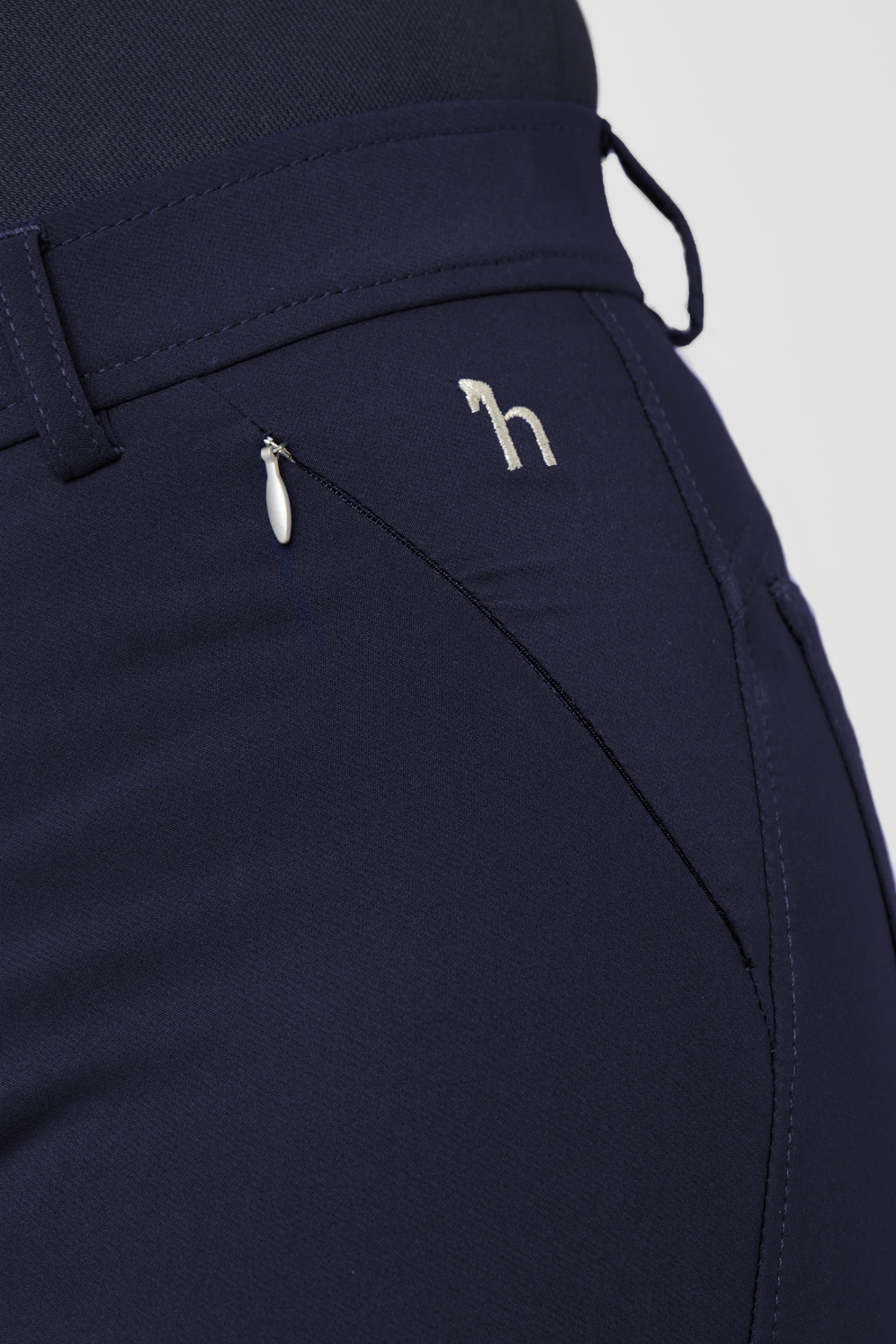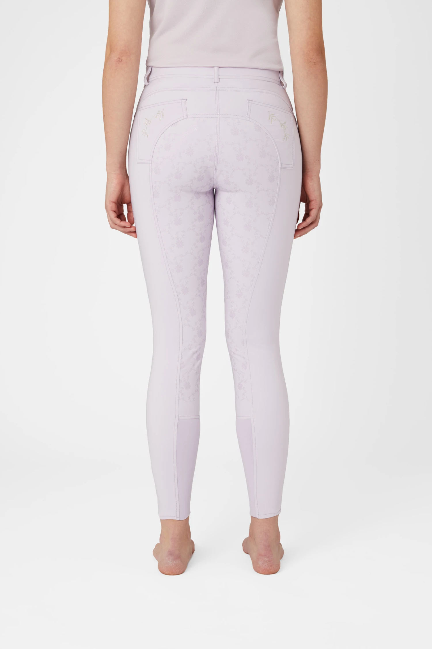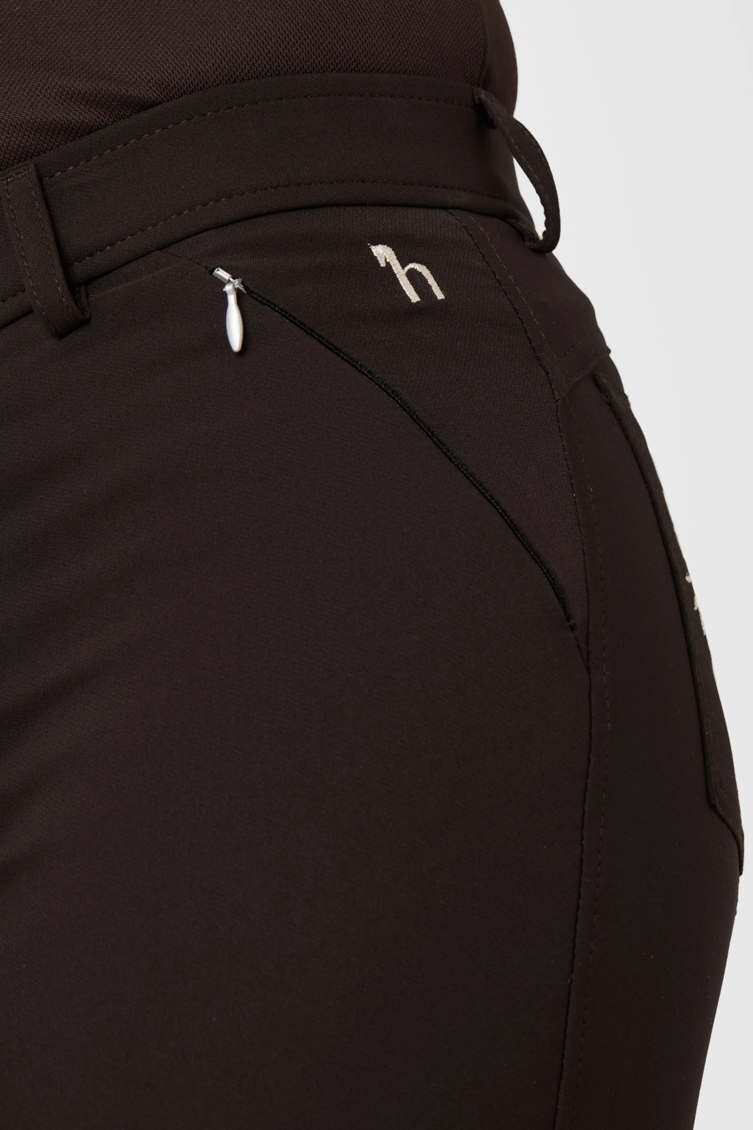 Die Horze Kaitlin Reithose besteht aus weichem, elastischem Material. Vordertaschen mit Reißverschlüssen bieten Platz für dein Handy. Die Hintertaschen sind mit silbernen Blättern bestickt und passen zu dem floralen Silikonvollbesatz. Gedeckte Farben passen perfekt in deine Reitgarderobe.