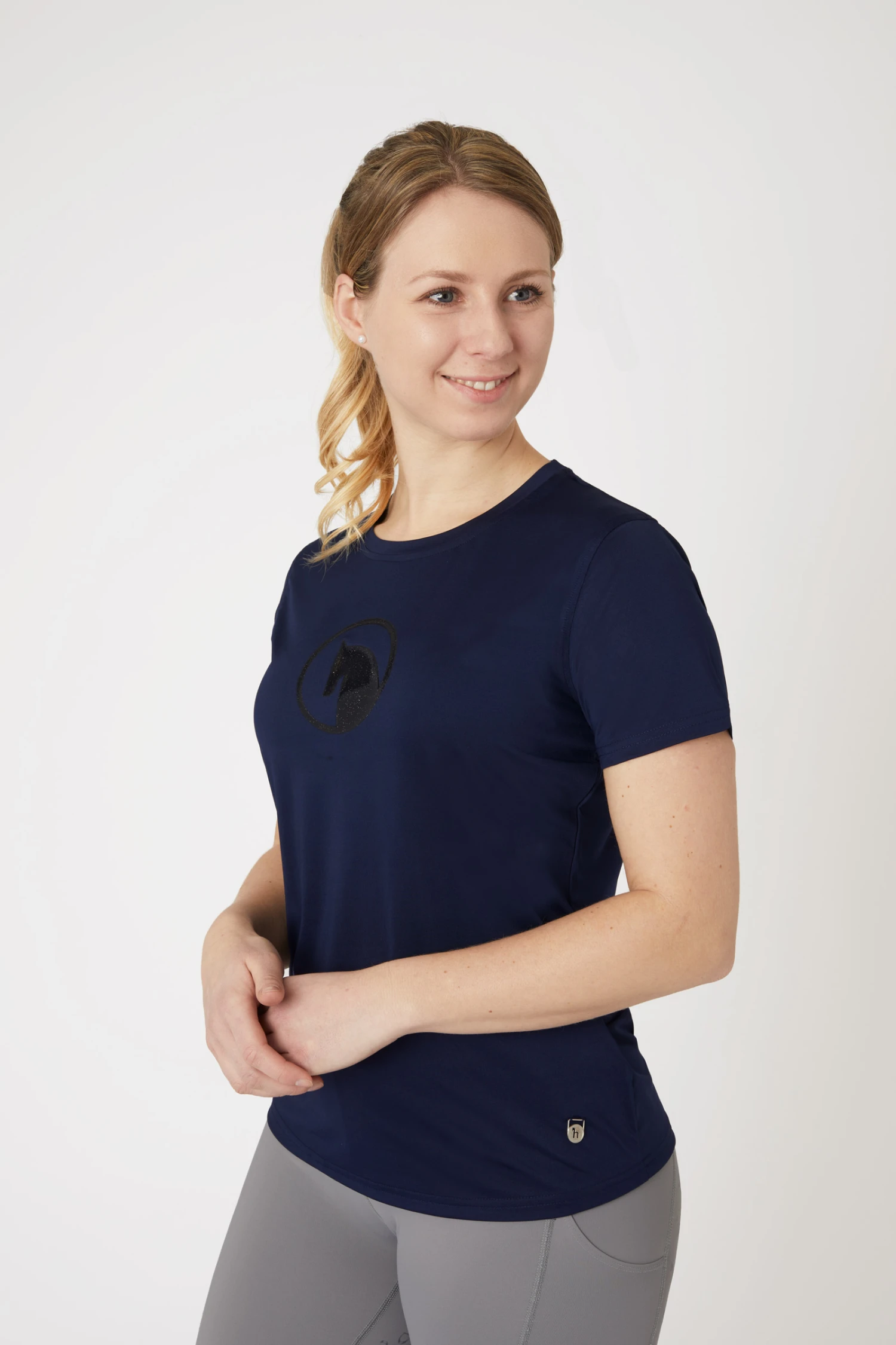 - Kleiner Horze-Logoanhänger aus Metall am Ärmel