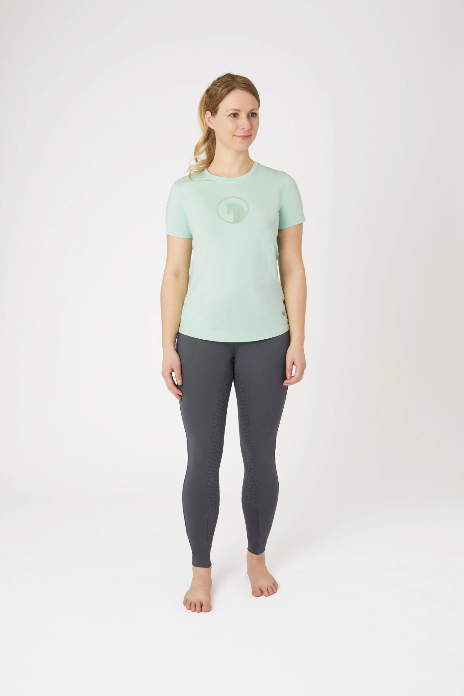 Dieses schlichte, funktionelle Modell hat ein großes Logo in glänzendem Metallic-Druck auf der Brust. Das atmungsaktive, schnell trocknende Mikrofasergewebe ist hautfreundlich und pflegeleicht. Eine perfekte Wahl, wenn du ein Basic in deiner Reitgarderobe haben möchtest.