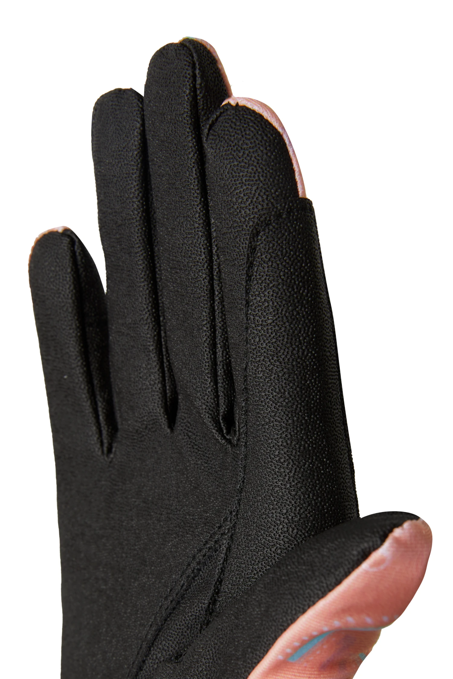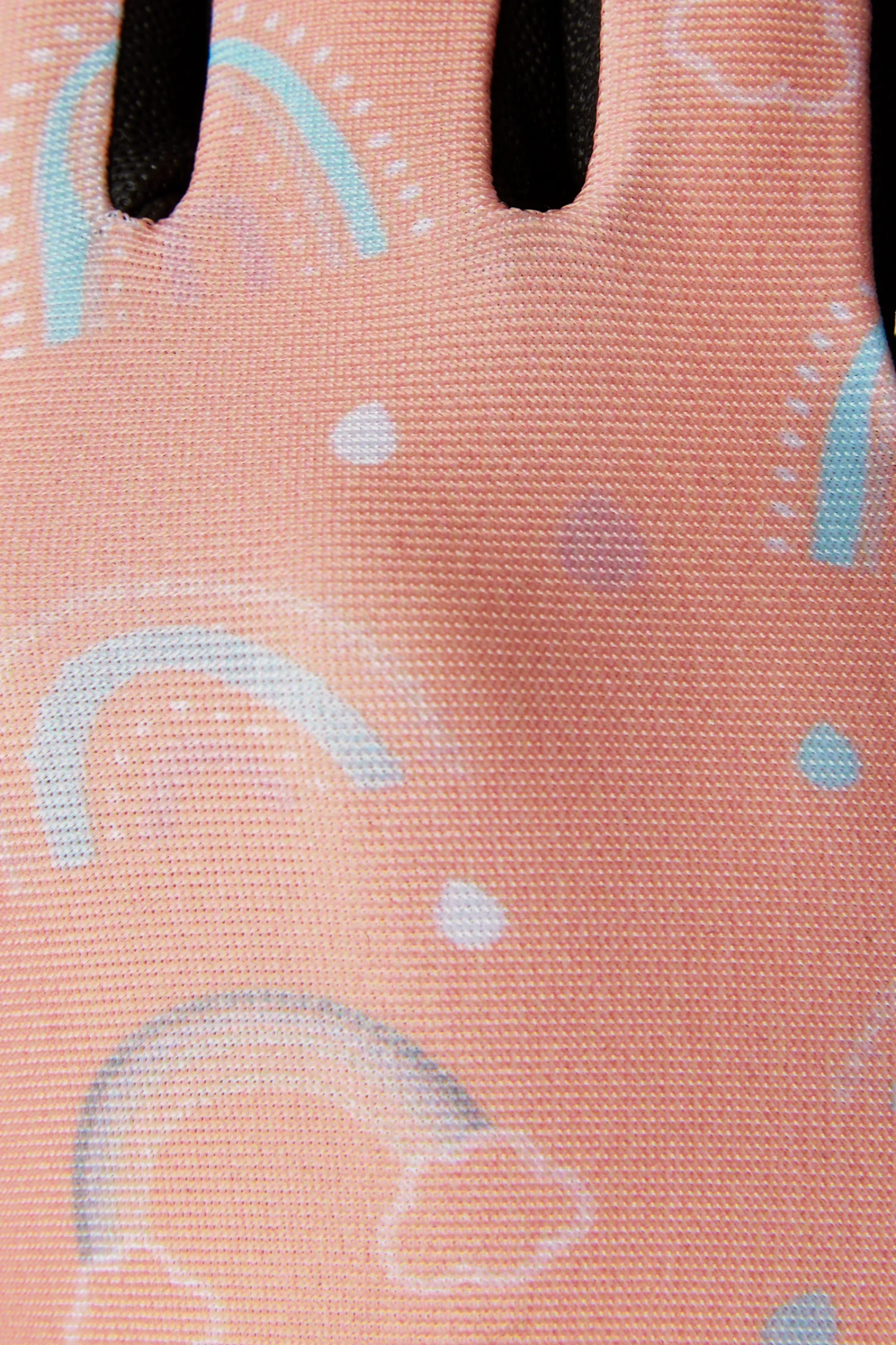 Bunte Kinderhandschuhe mit Regenbogen-Print auf der Oberhand. Das dehnbare Obermaterial sorgt für ein angenehmes Tragegefühl, während die Handfläche aus Kunstleder die Zügel fest im Griff hat. Zusätzliche Verstärkungen im Bereich der Zügel sorgen für zusätzlichen Schutz.