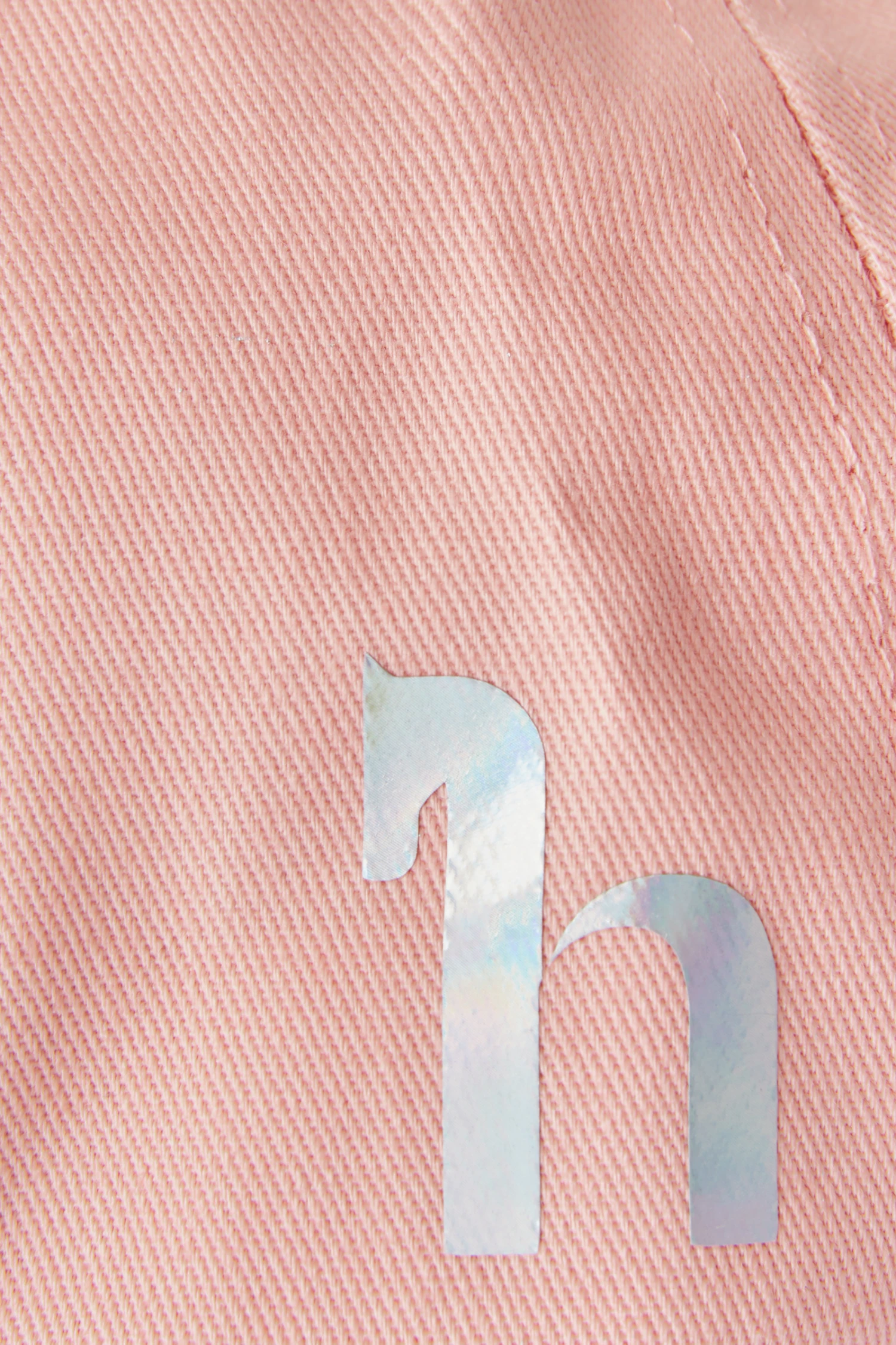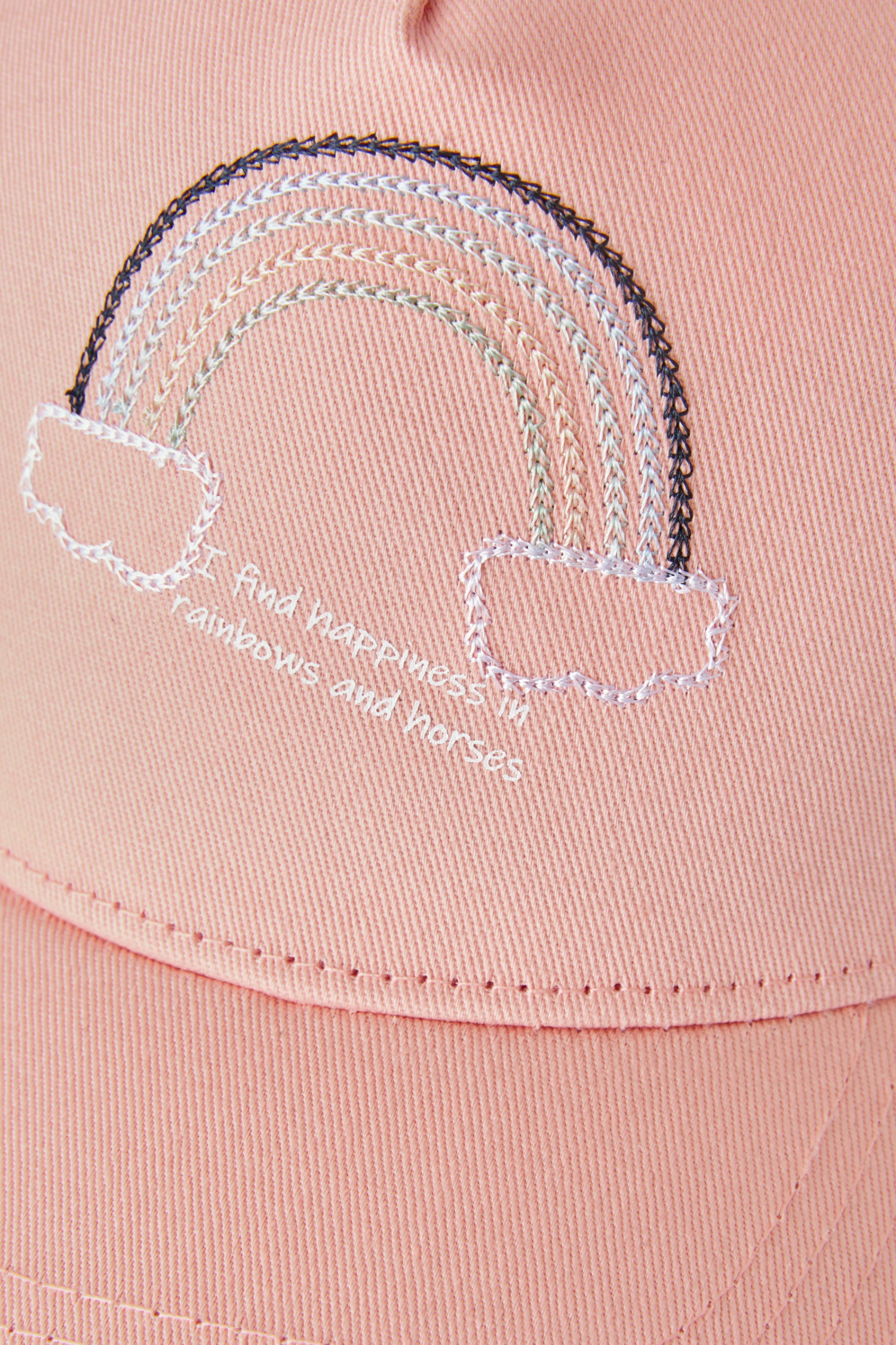 Ein schöner Schutz vor der Sonne mit einer süßen Stickerei auf der Vorderseite und einem kleinen holografischen „h“ an der Seite. Die Stickerei lautet „I find happiness in rainbows and horses“ (Ich finde das Glück in Regenbögen und Pferden) und hat einen gestickten Look in Pastellfarben.