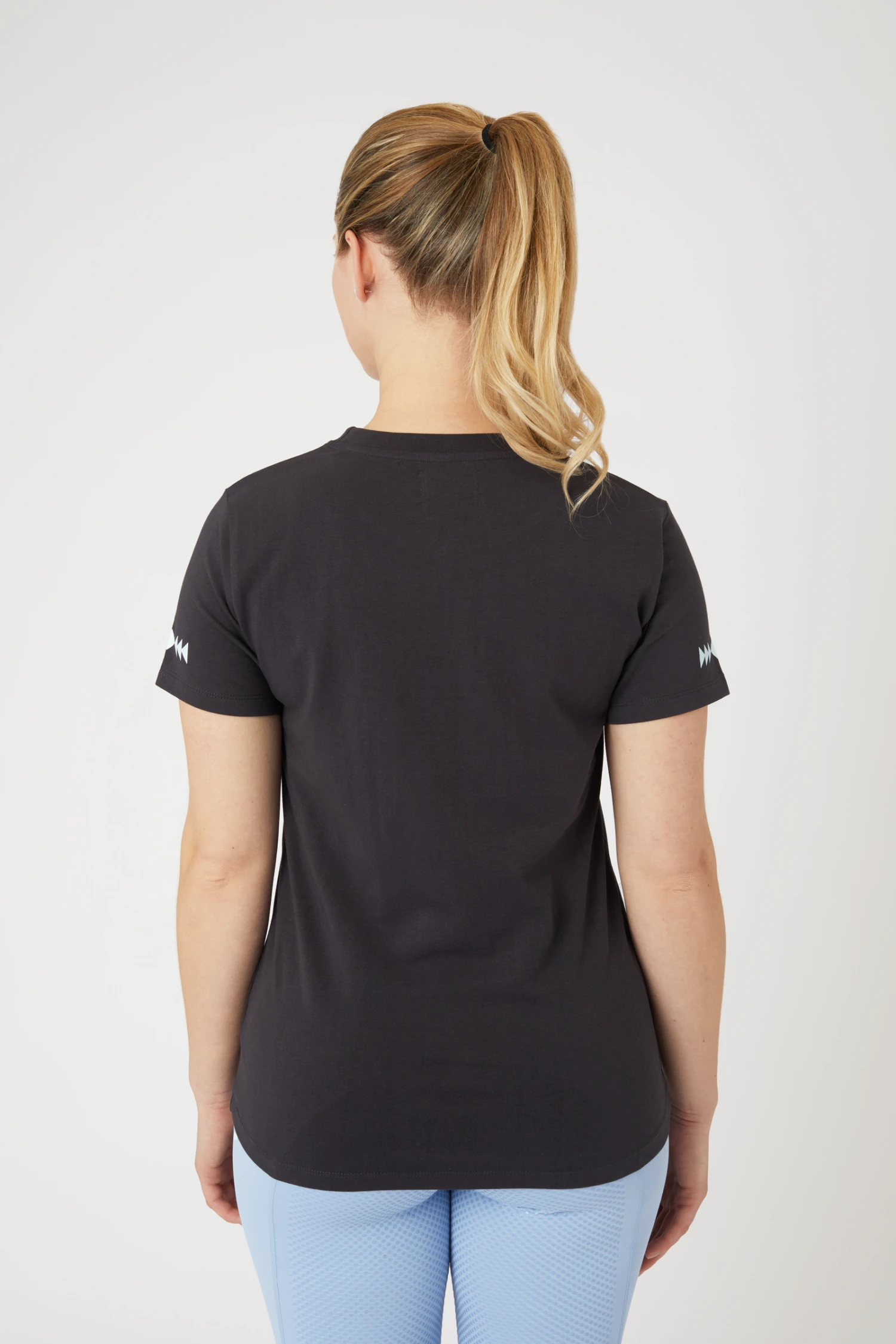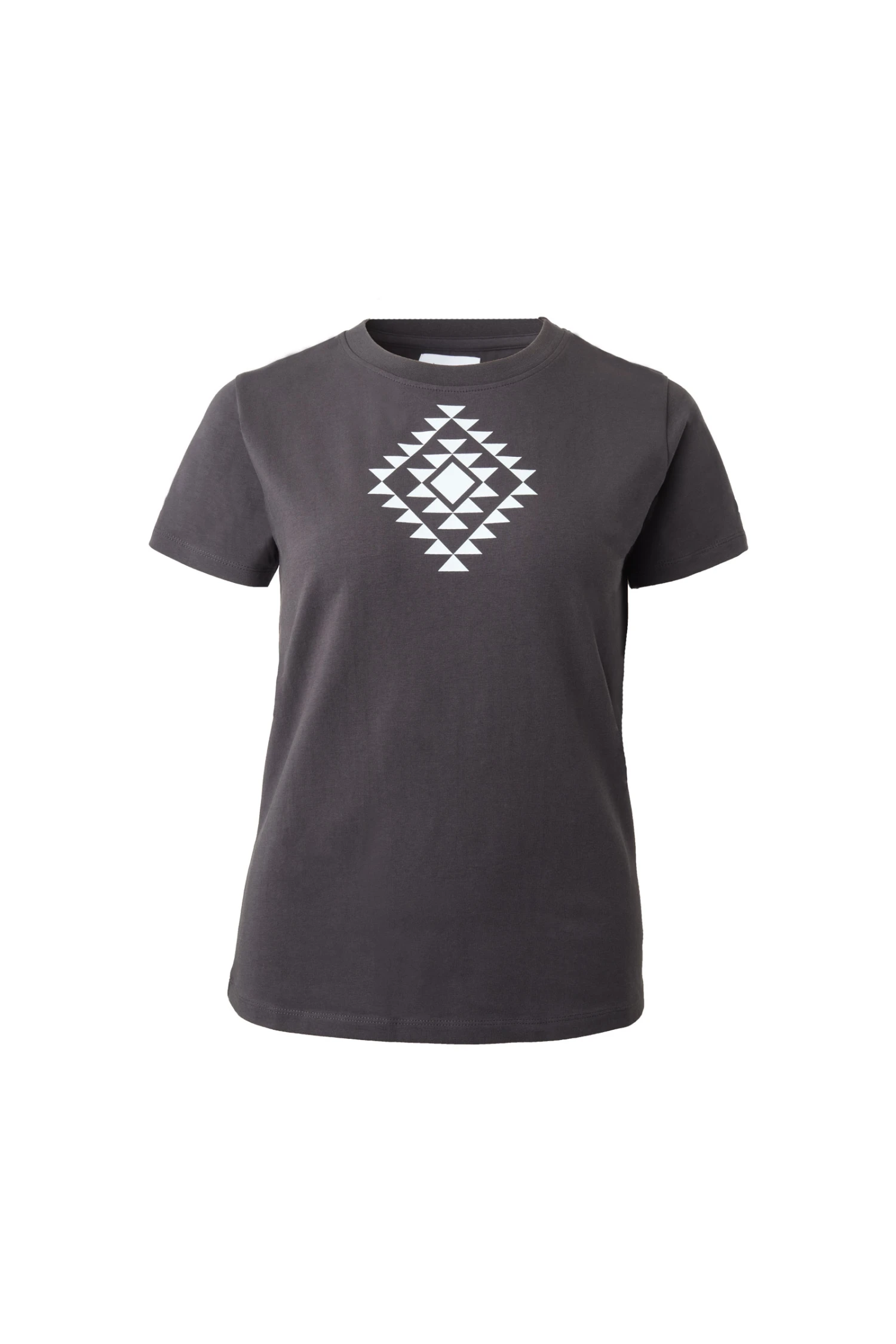 Das Zion Shirt für Damen ist aus einem Baumwollstoff gefertigt, der sich angenehm auf der Haut anfühlt. Auf der Brust befindet sich ein großer aztekisch inspirierter Druck in passenden Farben. Beide Ärmel haben kleinere Versionen des Musters.