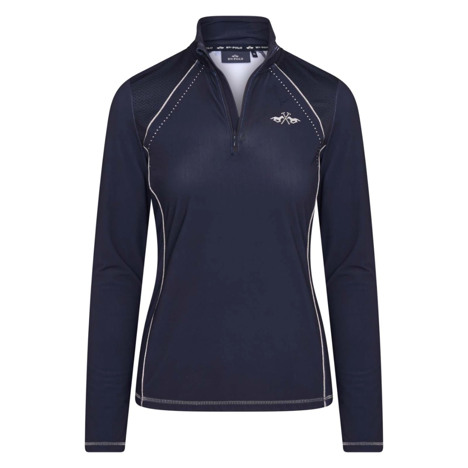 Ein elegantes, geformtes Funktions-Poloshirt mit halbem Reißverschluss. Superschicke Paspeln im Metallic- Look entlang der Schultern und Teilnähte. Strasssteine an den Schultern sorgen für ein schönes Funkeln und ein luxuriöses Aussehen. Passende Netzapplikationen an den Schultern sorgen für einen sportlichen Look. Glänzendes Logo auf der linken Brustseite.