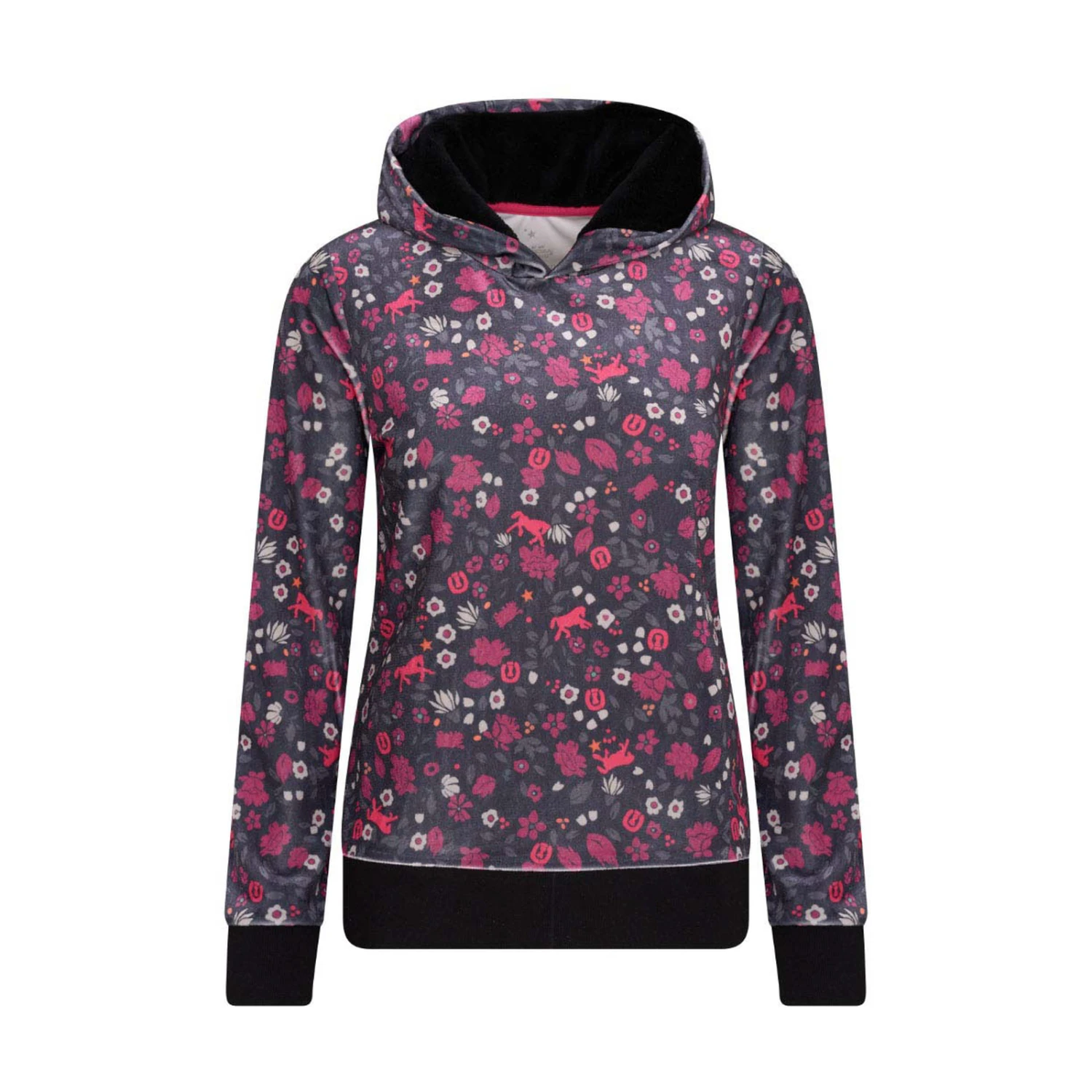 Glänze und genieße die Blumenpracht mit diesem weichen und bequemen Kapuzenpullover. Hast du die versteckten Pferde schon entdeckt? Lass uns ein Spiel spielen und sie zählen. Das samtige Jersey-Material mit dem Flower-Power-Allover-Print sorgt für einen sehr schicken Reiter-Look. Perfekt für dich!