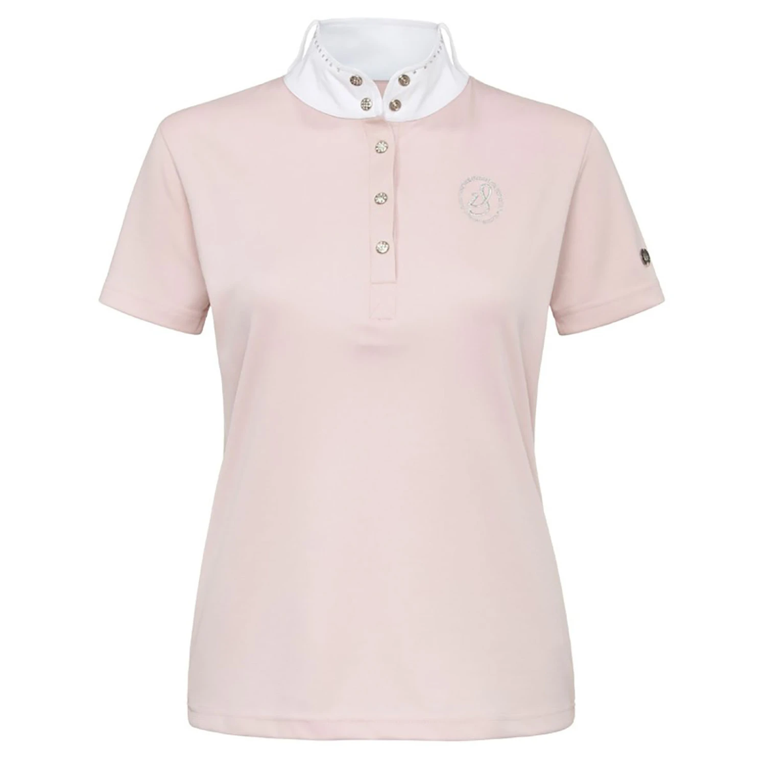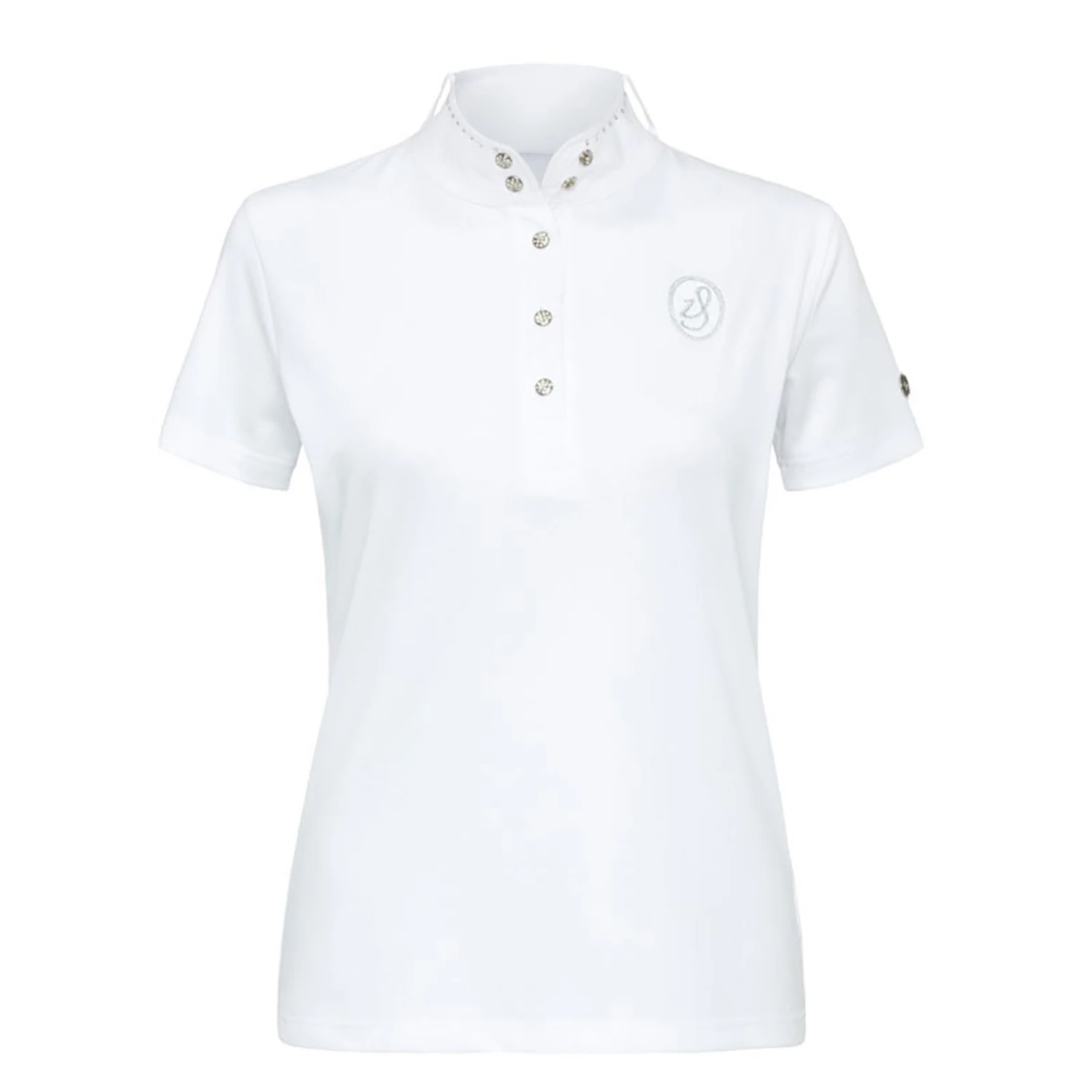 Fashionable ladies competition shirt with stones on collar and chest embroidery. With short sleeves.
