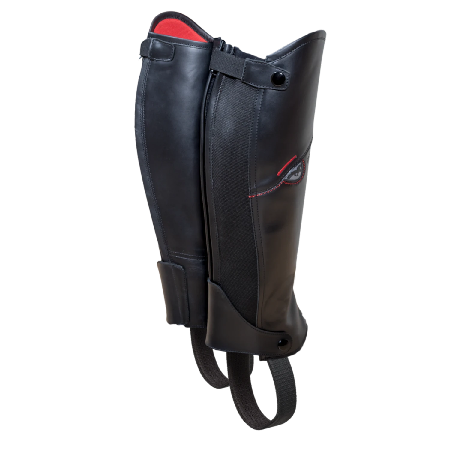 Mini-Chaps mit toller Passform durch hochwertiges Leder und zusätzliche Gummizone. Der elastische Fußriemen sorgt dafür, dass er korrekt am Stiefel befestigt bleibt und angenehm zu tragen ist. Reißverschluss und Druckknöpfe schließen auf der Rückseite.