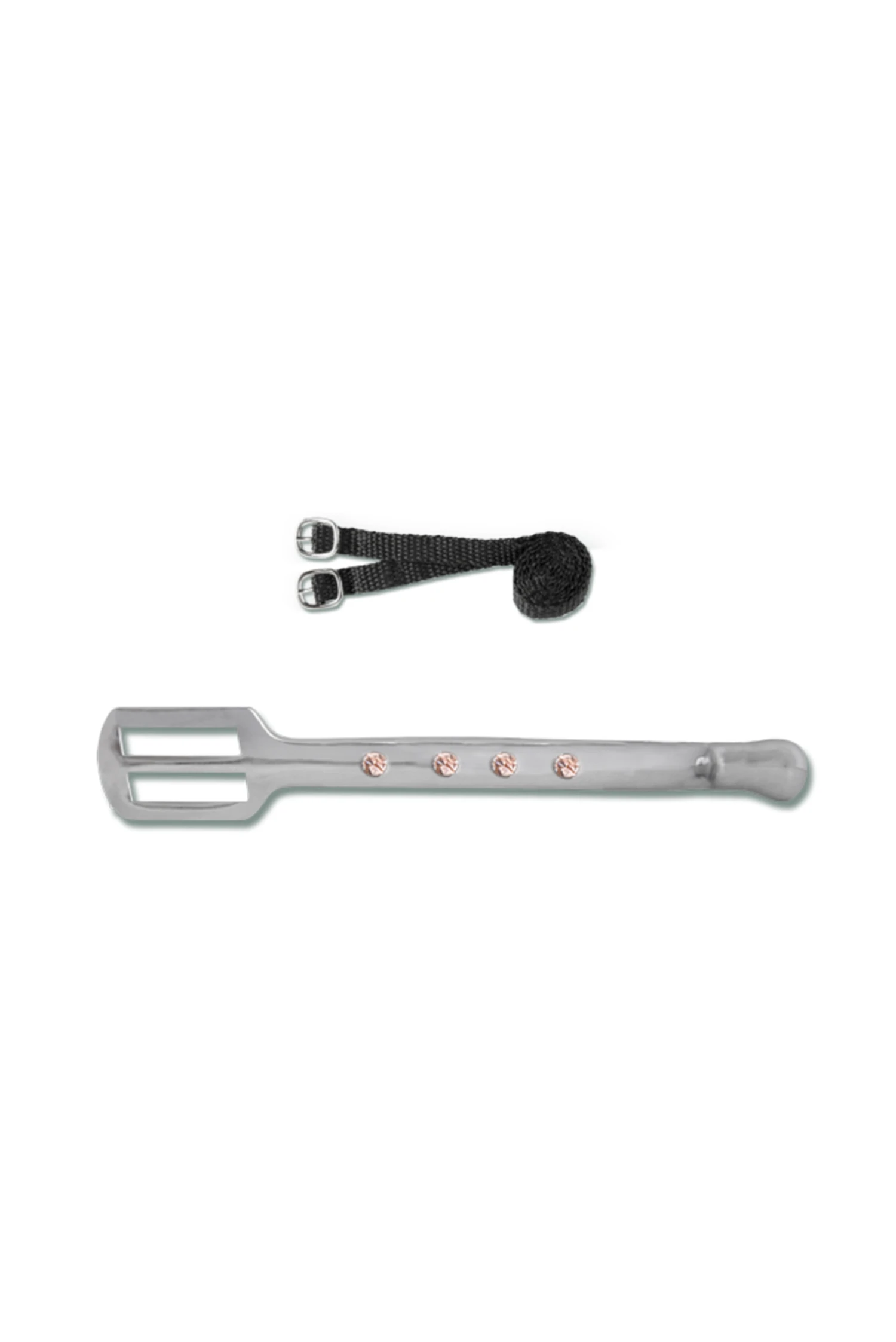 Sporen mit Dorn, auf der Außenseite mit Strasssteinen besetzt. Mit Perlonesorenriemen, Rostfrei, Paar.